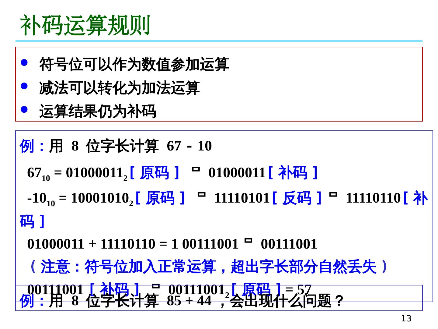 13 .13 补码运算规则 符号位可以作为数值参加运算 减法可以转化为加法运算 运算结果仍为补码 例: 用 8 位字长计算 67 - 10 67 10 = 01000011 2 [ 原 码 ] 01000011 [ 补码 ] -10 10 = 10001010 2 [ 原 码 ] 11110101 [ 反码 ] 11110110 [ 补码 ] 01000011 + 11110110 = 1 00111001 00111001 ( 注意: 符号位 加入正常运算,超出字长部分 自然丢失 ) 00111001 [ 补码 ] 00111001 2 [ 原 码 ] = 57 例: 用 8 位字长计算 85 + 44 ,会出现什么问题?