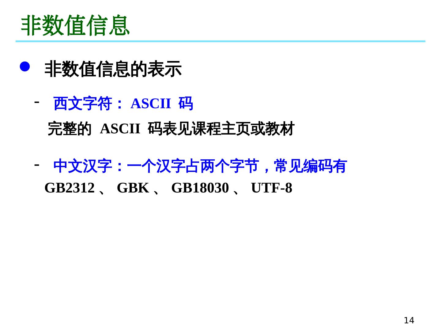 14 .14 非数值信息 西文字符: ASCII 码 中文汉字:一个汉字占两个字节,常见编码有 GB2312 、 GBK 、 GB18030 、 UTF-8 完整的 ASCII 码表见课程主页或教材 非数值信息的表示