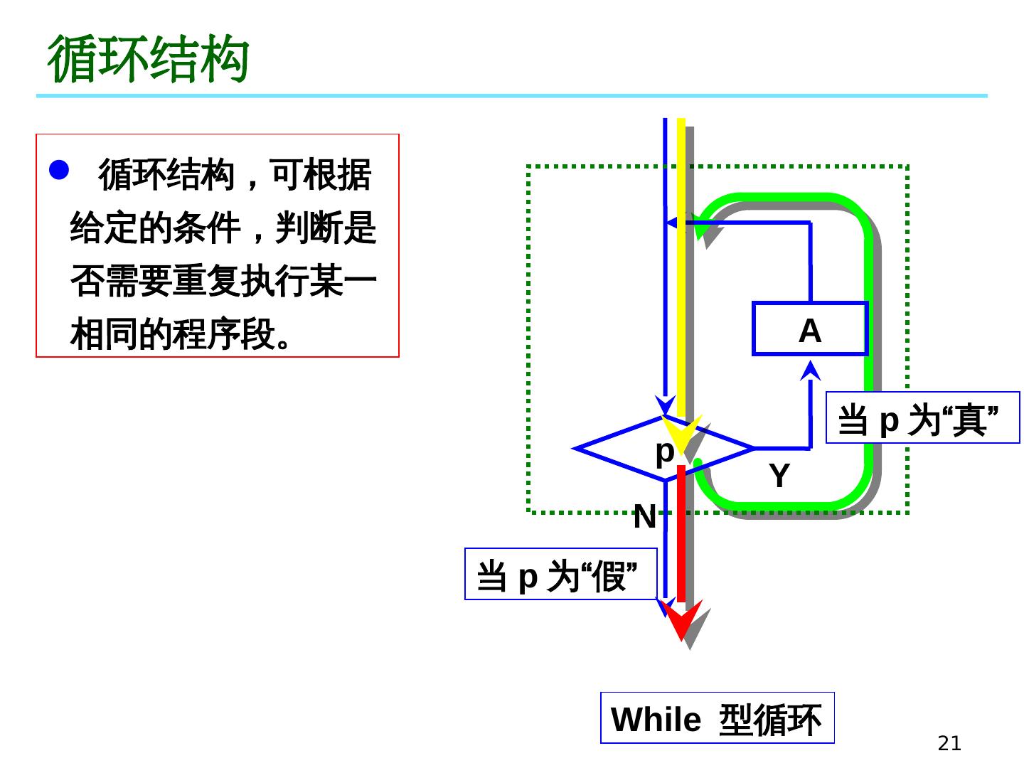 21 .21 循环结构 A p Y While 型循环 N 当 p 为“真” 当 p 为“假” 循环结构,可根据给定的条件,判断是否需要重复执行某一相同的程序段。