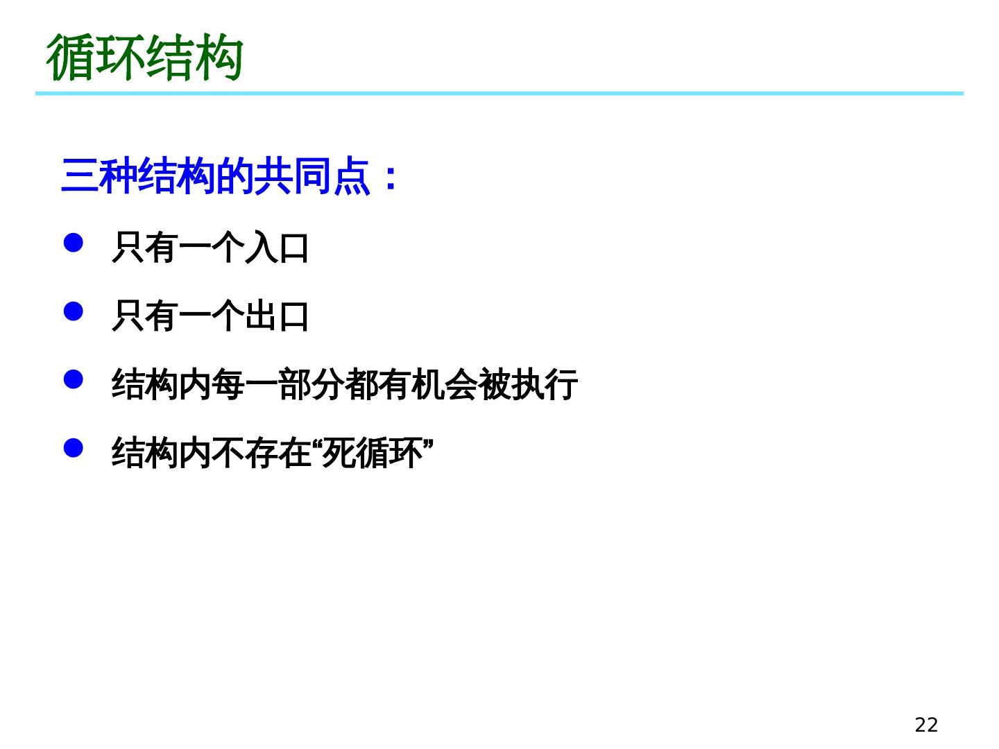 22 .22 循环结构 三种结构的共同点: 只有一个入口 只有一个出口 结构内每一部分都有机会被执行 结构内不存在“死循环”