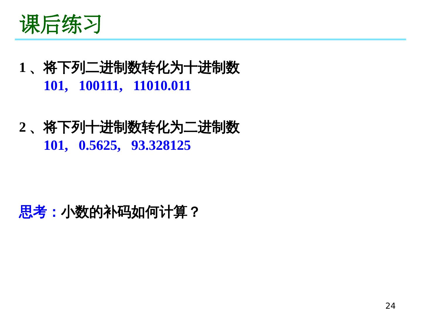 24 .24 课后练习 1 、将下列二进制数转化为十进制数 101, 100111, 11010.011 2 、将下列十进制数转化为二进制数 101, 0.5625, 93.328125 思考: 小数的补码如何计算?