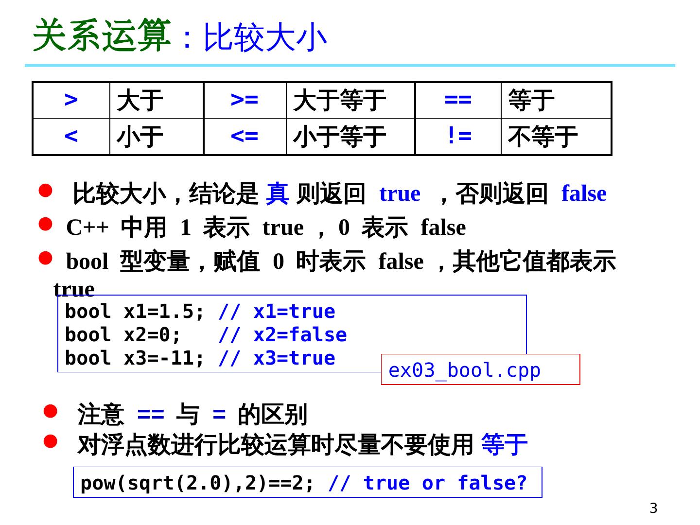 3 .3 关系运算 :比较大小 > 大于 >= 大于等于 == 等于 < 小于 <= 小于等于 != 不等于 比较大小,结论是 真 则返回 true ,否则返回 false C++ 中用 1 表示 true , 0 表示 false bool 型变量,赋值 0 时表示 false ,其他它值都表示 true 注意 == 与 = 的区别 对浮点数进行比较运算时尽量不要使用 等于 bool x1=1.5; // x1=true bool x2=0; // x2=false bool x3=-11; // x3=true pow( sqrt (2.0),2)==2; // true or false? ex03_bool.cpp