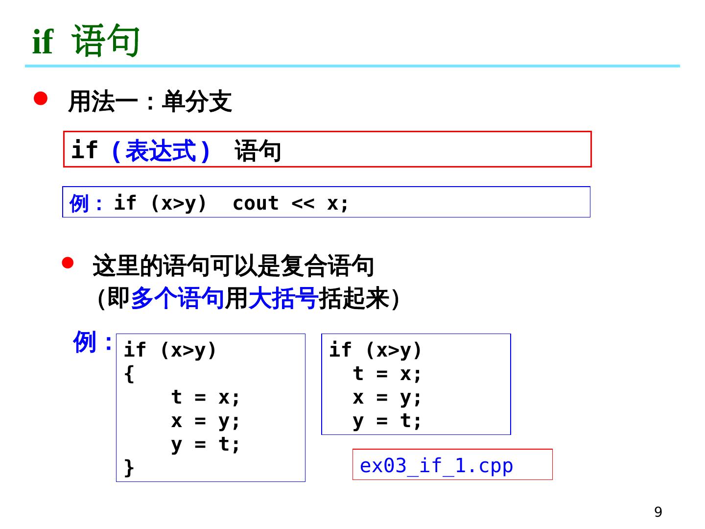 9 .9 if 语句 用法一:单分支 if ( 表达式 ) 语句 例: if (x>y) cout << x; 这里的语句可以是复合语句 (即 多个语句 用 大括号 括起来) if (x>y) t = x; x = y; y = t; 例: if (x>y) { t = x; x = y; y = t; } ex03_if_1.cpp