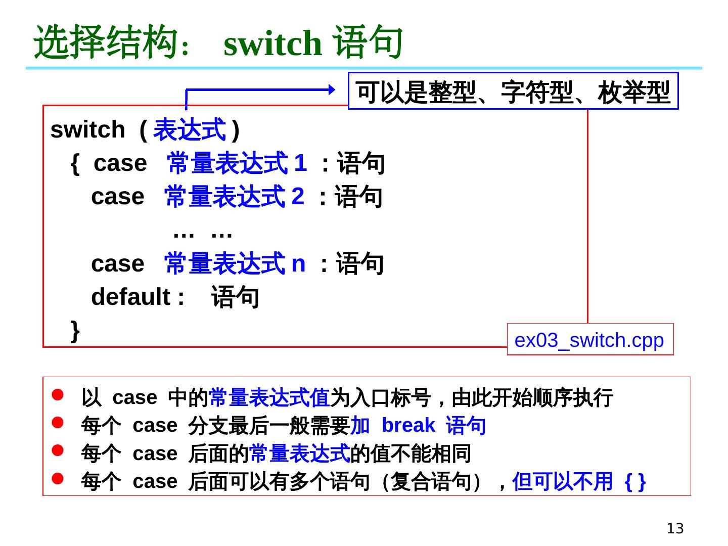 13 .13 选择结构: switch 语句 switch ( 表达式 ) { case 常量表达式 1 :语句 case 常量表达式 2 :语句 … … case 常量表达式 n :语句 default : 语句 } 以 case 中的 常量表达式值 为入口标号,由此开始顺序执行 每个 case 分支最后 一般需要 加 break 语句 每个 case 后面的 常量表达式 的值不能相同 每个 case 后面可以有多个语句(复合语句), 但可以不用 { } 可以是整型、字符型、枚举型 ex03_switch.cpp