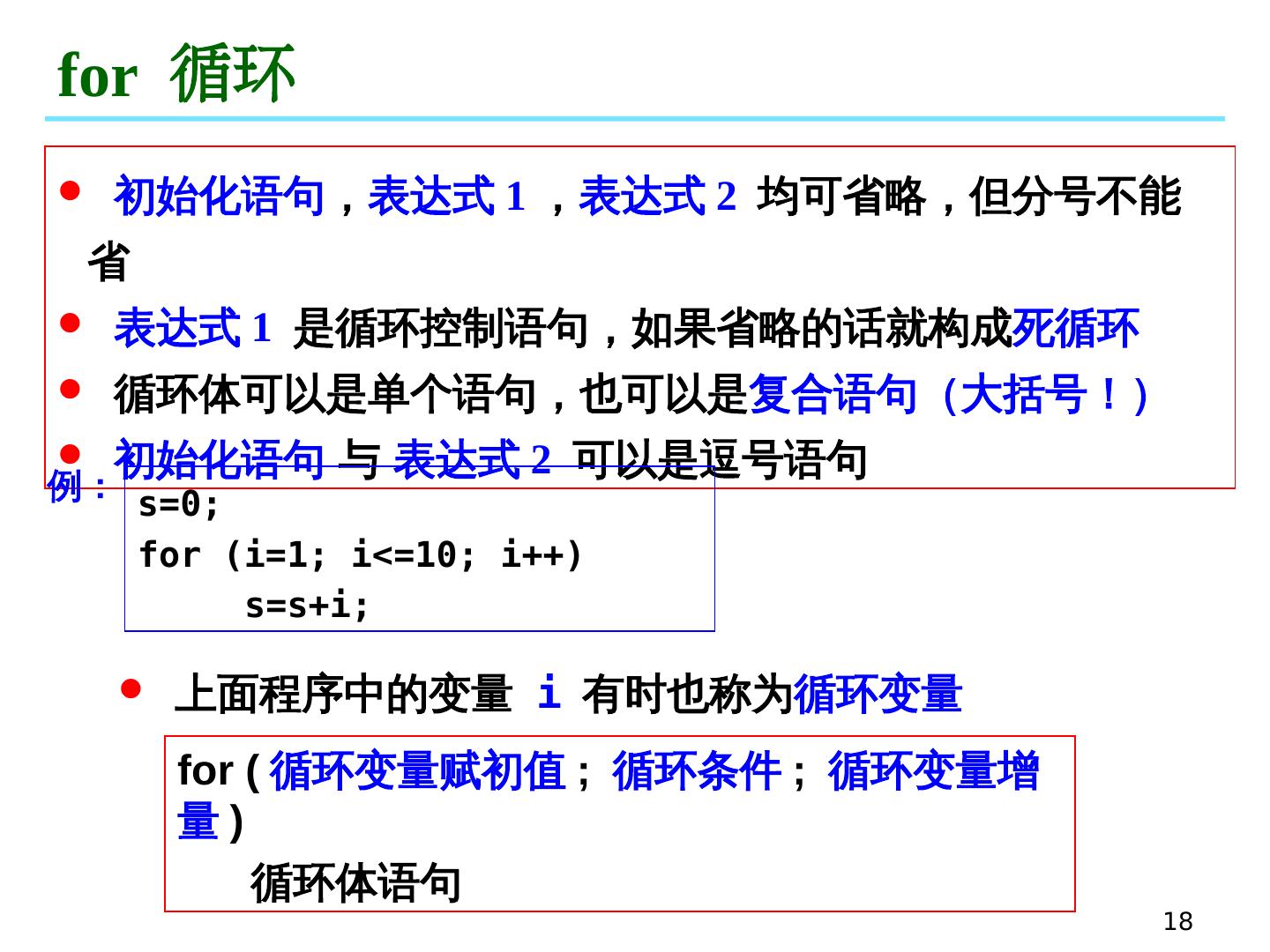 17 .17 for 循环 for ( 初始化语句 ; 表达式 1 ; 表达式 2 ) 循环体语句 表达式 1 初始化语句 真 表达式 2 循环体语句 假 执行过程 (1) 执行 初始化语句 (2) 计算 表达式 1 的值, 如果是“真”,则执行循环体语句, 否则退出循环 (3) 执行 表达式 2 ,返回第二步 ;