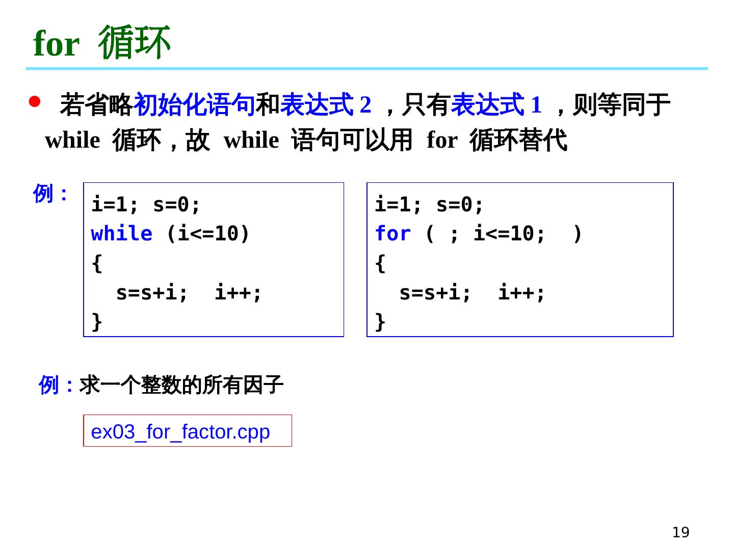 19 .19 for 循环 若省略 初始化语句 和 表达式 2 ,只有 表达式 1 ,则等同于 while 循环,故 while 语句可以用 for 循环替代 i=1; s=0; while (i<=10) { s=s+i; i++; } 例: i=1; s=0; for ( ; i<=10; ) { s=s+i; i++; } 例: 求一个整数的所有因子 ex03_for_factor.cpp