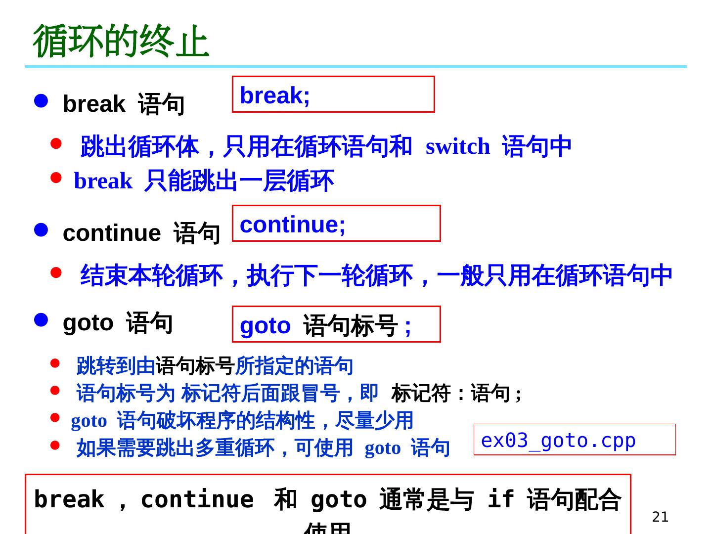 20 .20 for 循环 循环变量可以在初始化语句中声明,这样,循环变量只在该循环内有效,即循环结束后,循环变量即被释放 例: s=0; for ( int i=1 ; i<=10; i++) s=s+i; 关于变量的作用域和生存期,详见后面的讲义