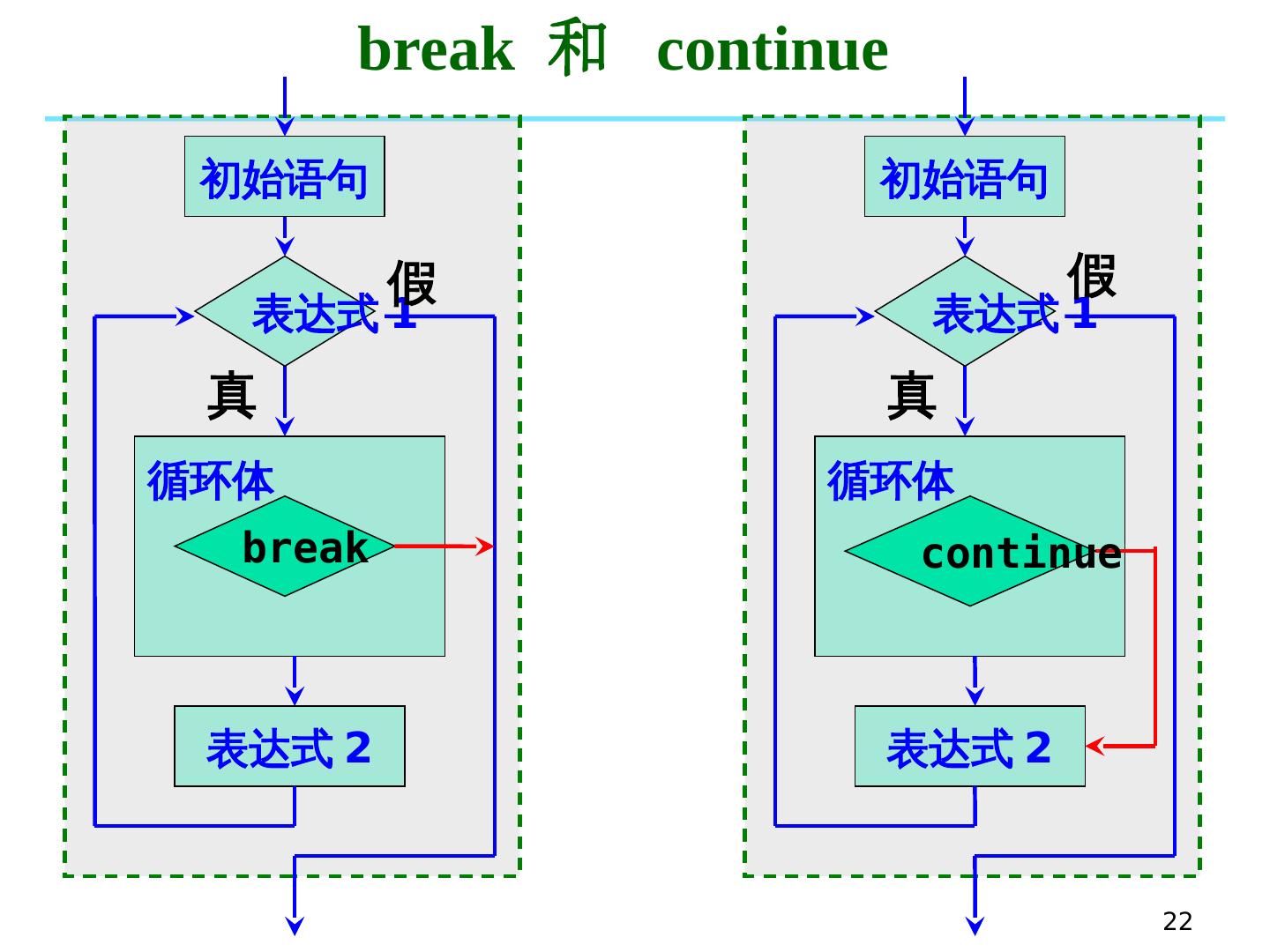 22 .22 break 和 continue 表达式 1 初始语句 真 表达式 2 假 循环体 continue 表达式 1 初始语句 真 表达式 2 假 循环体 break