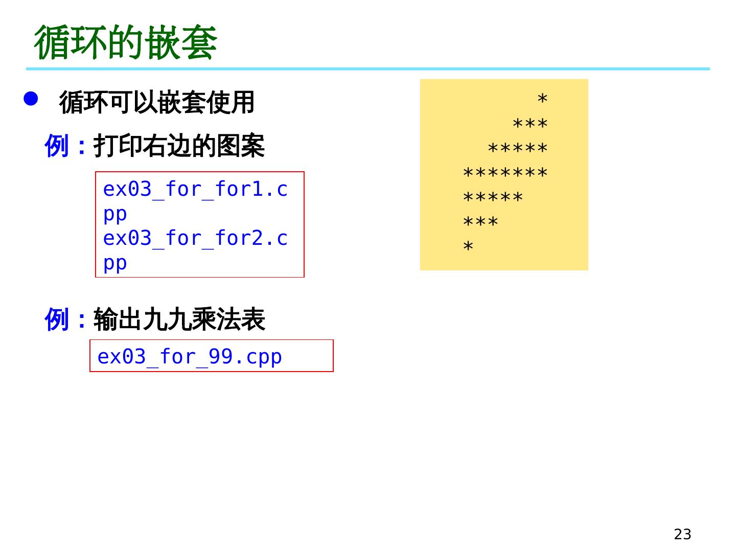 23 .23 循环的嵌套 循环可以嵌套使用 例: 打印右边的图案 ex03_for_for1.cpp ex03_for_for2.cpp * *** ***** ******* ***** *** * 例: 输出九九乘法表 ex03_for_99.cpp