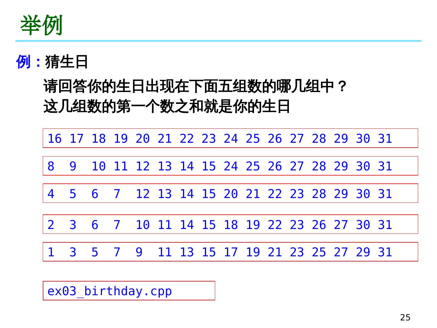 25 .25 举例 例: 猜生日 16 17 18 19 20 21 22 23 24 25 26 27 28 29 30 31 请回答你的生日出现在下面五组数的哪几组中? 这几组数的第一个数之和就是你的生日 8 9 10 11 12 13 14 15 24 25 26 27 28 29 30 31 4 5 6 7 12 13 14 15 20 21 22 23 28 29 30 31 2 3 6 7 10 11 14 15 18 19 22 23 26 27 30 31 1 3 5 7 9 11 13 15 17 19 21 23 25 27 29 31 ex03_ birthday.cpp