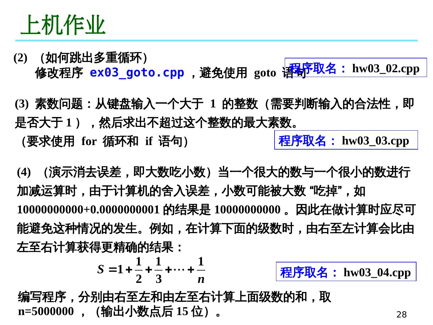 28 .28 上机作业 (3) 素数问题:从键盘输入一个大于 1 的整数(需要判断输入的合法性,即是否大于 1 ),然后求出不超过这个整数的最大素数。 (要求使用 for 循环和 if 语句) 程序取名: hw03_03.cpp (2) (如何跳出多重循环) 修改程序 ex03_goto.cpp ,避免使用 goto 语句 程序取名: hw03_02.cpp (4) (演示消去误差,即大数吃小数)当一个很大的数与一个很小的数进行加减运算时,由于计算机的舍入误差,小数可能被大数 “吃掉”,如 10000000000+0.0000000001 的结果是 10000000000 。因此在做计算时应尽可能避免这种情况的发生。例如,在计算下面的级数时,由右至左计算会比由左至右计算获得更精确的结果: 程序取名: hw03_04.cpp 编写程序,分别由右至左和由左至右计算上面级数的和,取 n=5000000 ,(输出小数点后 15 位)。