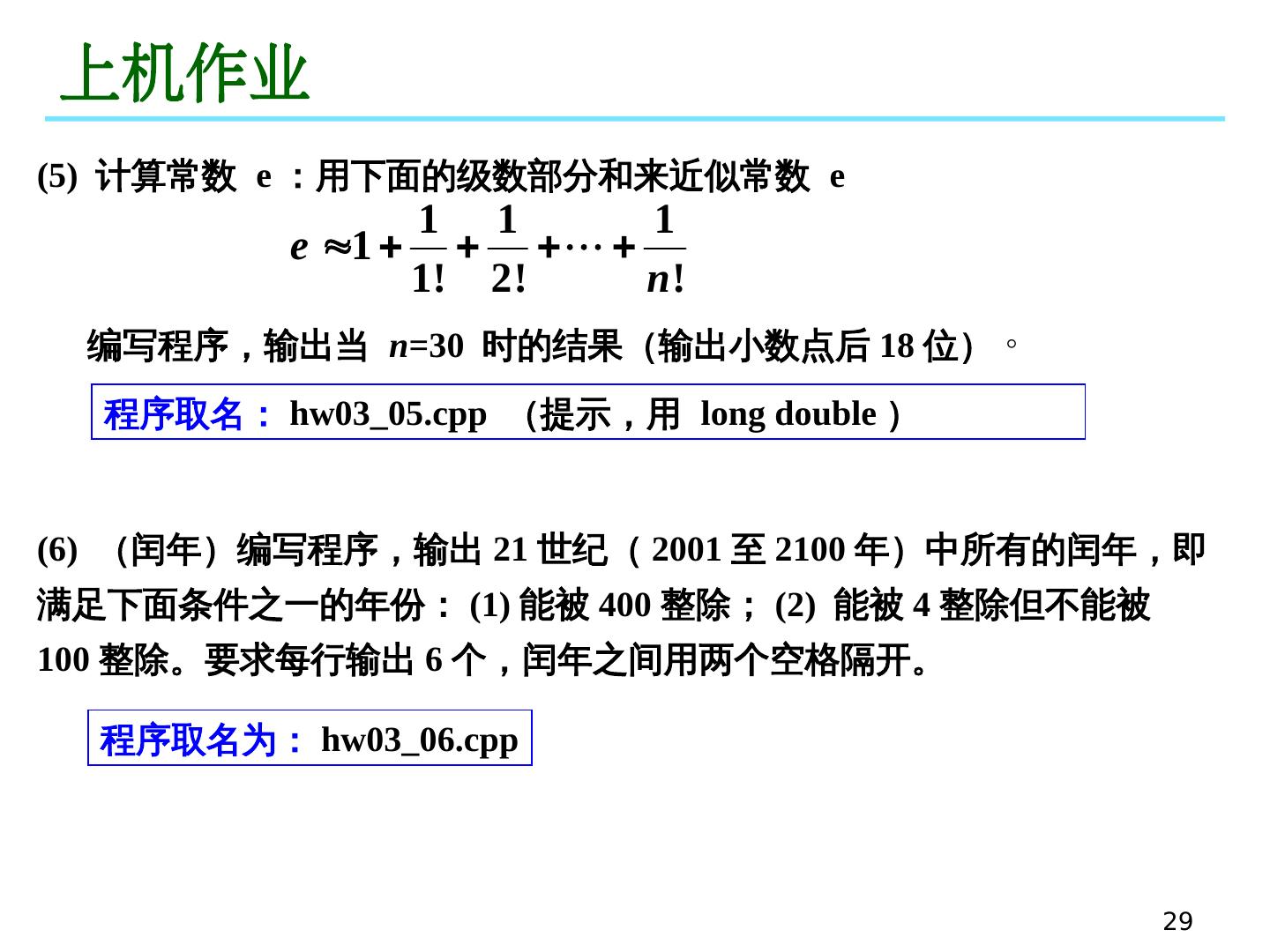 29 .29 上机作业 (5) 计算常数 e :用下面的级数部分和来近似常数 e 程序取名: hw03_05.cpp (提示,用 long double ) 编写程序,输出当 n =30 时的结果(输出小数点后 18 位) 。 (6) (闰年)编写程序,输出 21 世纪( 2001 至 2100 年)中所有的闰年,即满足下面条件之一的年份: (1) 能被 400 整除; (2) 能被 4 整除但不能被 100 整除。要求每行输出 6 个,闰年之间用两个空格隔开。 程序取名为: hw03_06.cpp