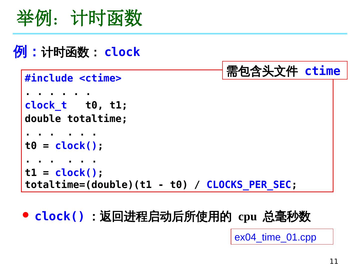 11 .11 举例:计时函数 #include < ctime > . . . . . . clock_t t0, t 1 ; double totaltime ; . . . . . . t0 = clock() ; . . . . . . t 1 = clock() ; totaltime =(double)(t 1 - t0) / CLOCKS_PER_SEC ; clock() : 返回 进程启动后所使用的 cpu 总毫秒数 ex04_time_01.cpp 需包含头文件 ctime 例: 计时函数: clock