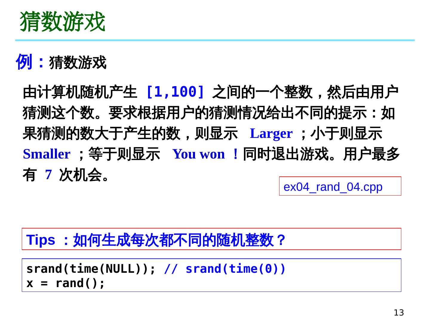 13 .13 猜数游戏 由计算机随机产生 [1,100] 之间的一个整数,然后由用户猜测这个数。要求根据用户的猜测情况给出不同的提示:如果猜测的数大于产生的数,则显示 Larger ;小于则显示 Smaller ;等于则显示 You won! 同时退出游戏。用户最多有 7 次机会。 ex04_rand_04.cpp Tips :如何生成每次都不同的随机整数? srand (time(NULL)); // srand (time(0 )) x = rand(); 例: 猜数游戏