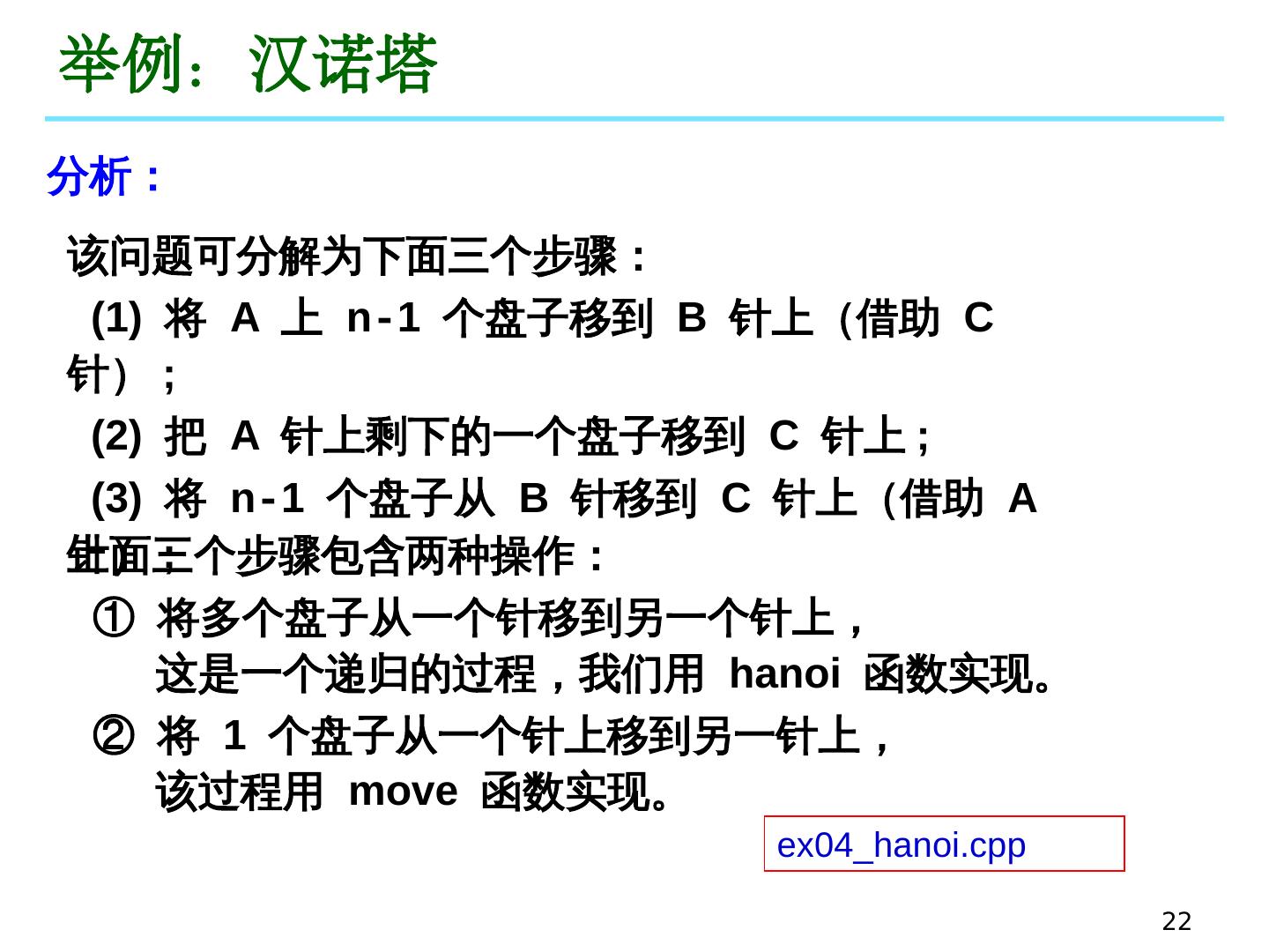 22 .22 举例:汉诺塔 分析: 该问题可分解为下面三个步骤: (1) 将 A 上 n - 1 个盘子移到 B 针上(借助 C 针) ; (2) 把 A 针上剩下的一个盘子移到 C 针上 ; (3) 将 n - 1 个盘子从 B 针移到 C 针上(借助 A 针) ; 上面三个步骤包含两种操作: ① 将多个盘子从一个针移到另一个针上, 这是一个递归的过程,我们用 hanoi 函数实现。 ② 将 1 个盘子从一个针上移到另一针上, 该过程用 move 函数实现。 ex04_hanoi.cpp