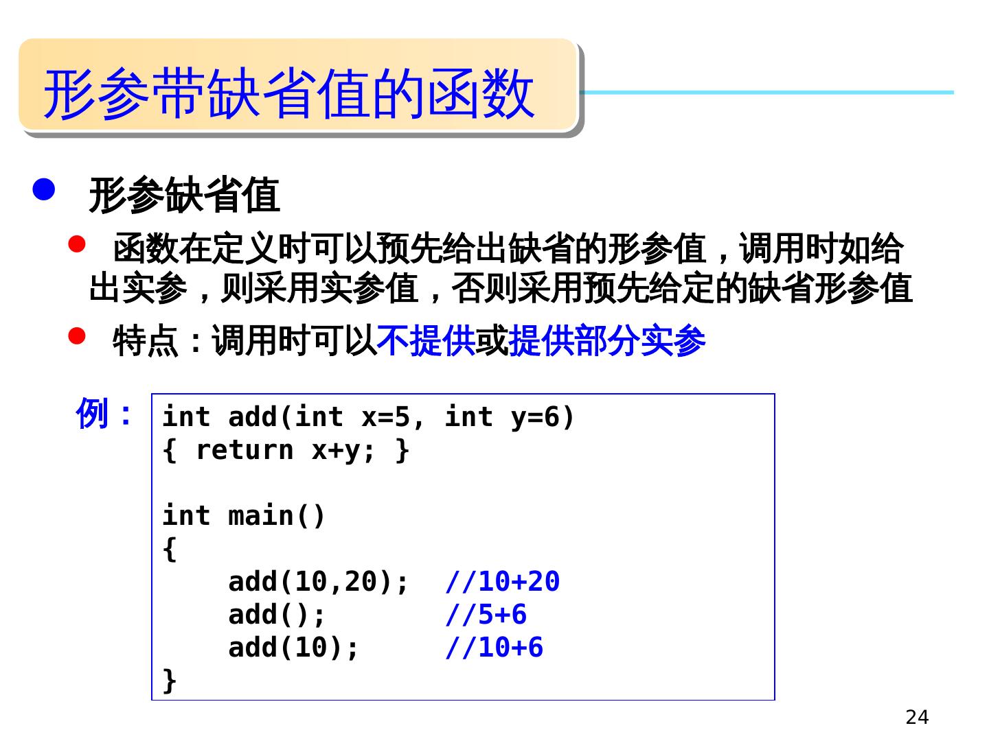 24 .24 形参带缺省值的函数 函数在定义时可以预先给出缺省的形参值,调用时如给出实参,则采用实参值,否则采用预先给定的缺省形参值 特点:调用时可以 不提供 或 提供部分实参 形参 缺省值 int add(int x=5, int y=6) { return x+y; } int main() { add(10,20); //10+20 add(); //5+6 add(10); //10+6 } 例: