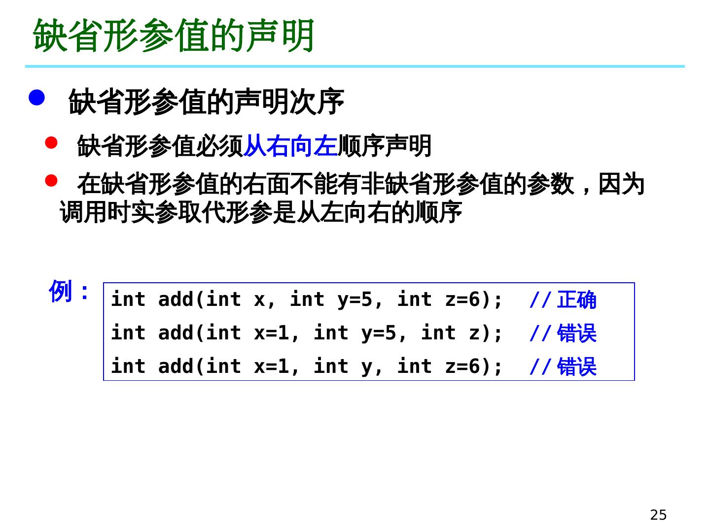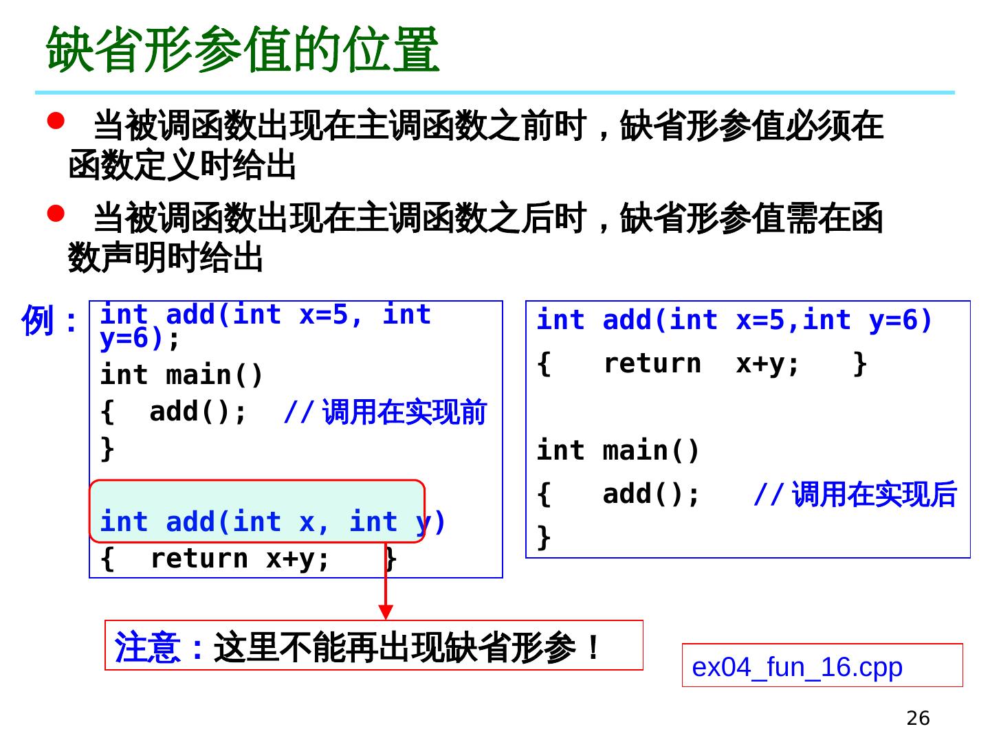 25 .25 缺省形参 值的声明 缺省形参值必须 从右向左 顺序声明 在缺省形参值的右面不能有非缺省形参值的参数,因为调用时实参取代形参是从左向右的顺序 缺省形参值的声明次序 int add(int x, int y=5, int z=6); // 正确 int add(int x=1, int y=5, int z); // 错误 int add(int x=1, int y, int z=6); // 错误 例: