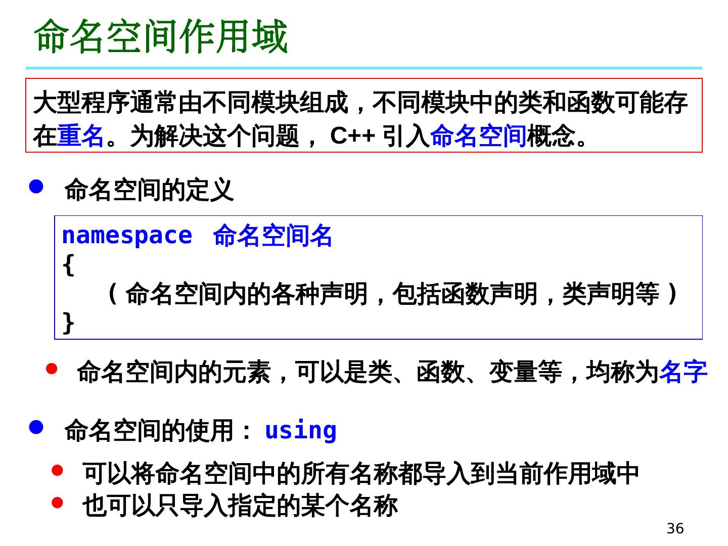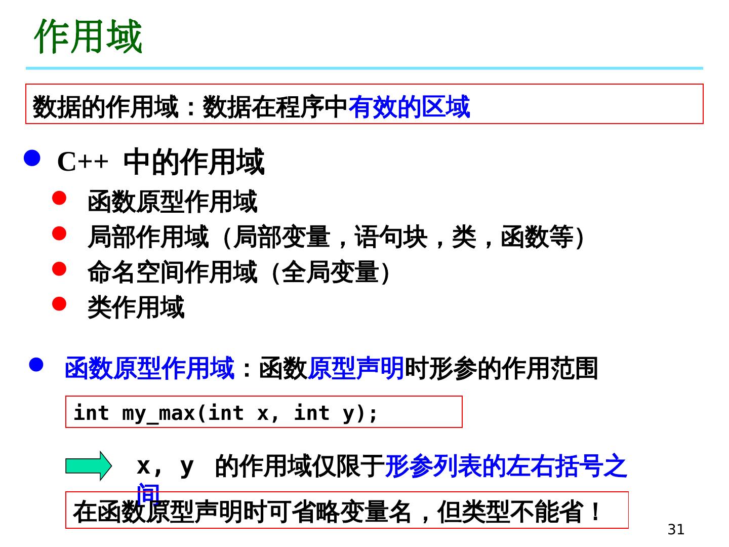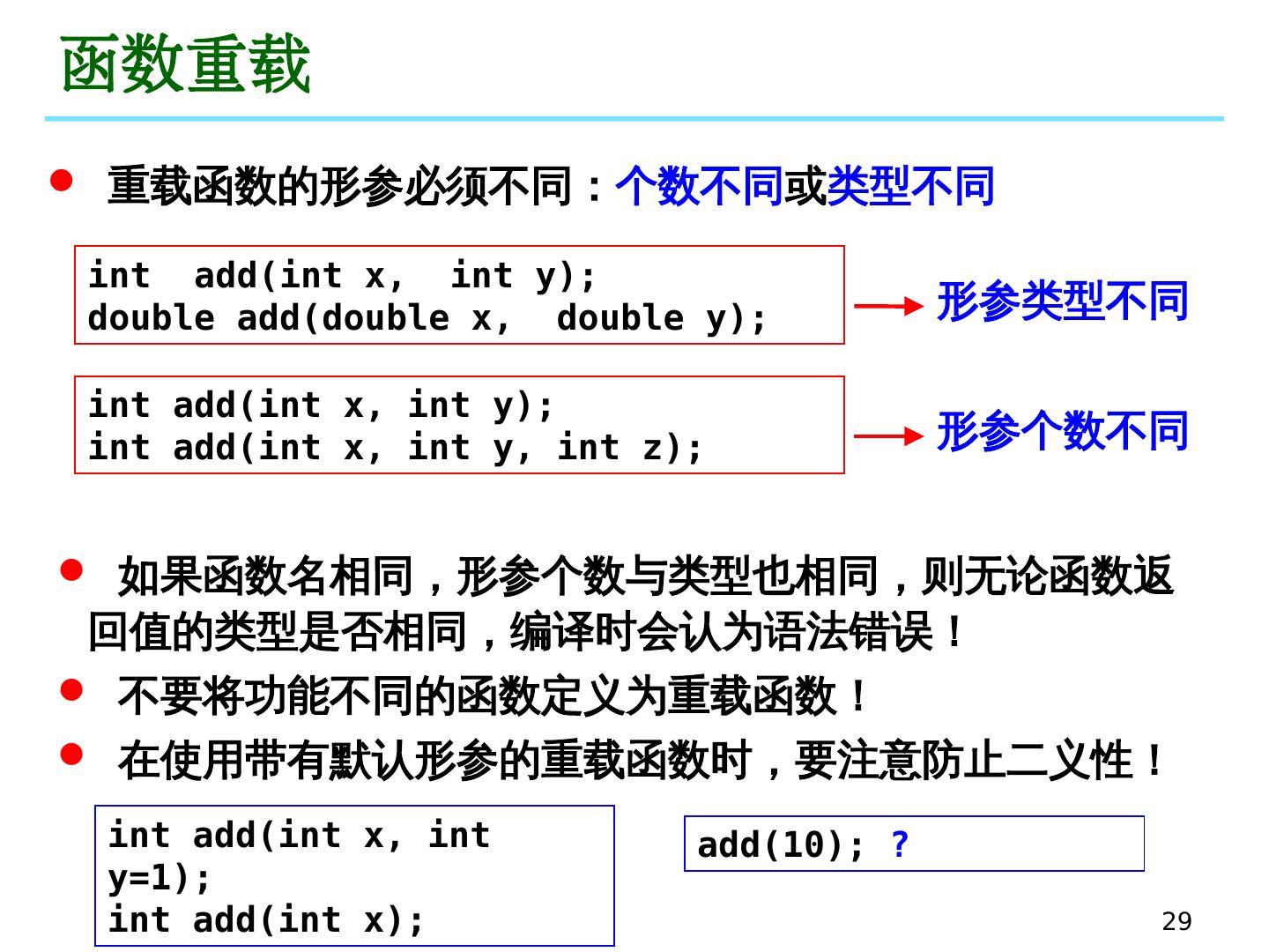 29 .29 函数重载 重载函数的形参必须不同: 个数不同 或 类型不同 形参类型不同 int add(int x, int y); double add(double x, double y); 形参个数不同 int add( int x, int y); int add( int x, int y, int z); 如果函数名相同,形参个数与类型也相同,则无论函数返回值的类型是否相同,编译时会认为语法错误! 不要将功能不同的函数定义为重载函数! 在使用带有默认形参的重载函数时,要注意防止二义性! int add(int x, int y=1); int add(int x); add(10); ?