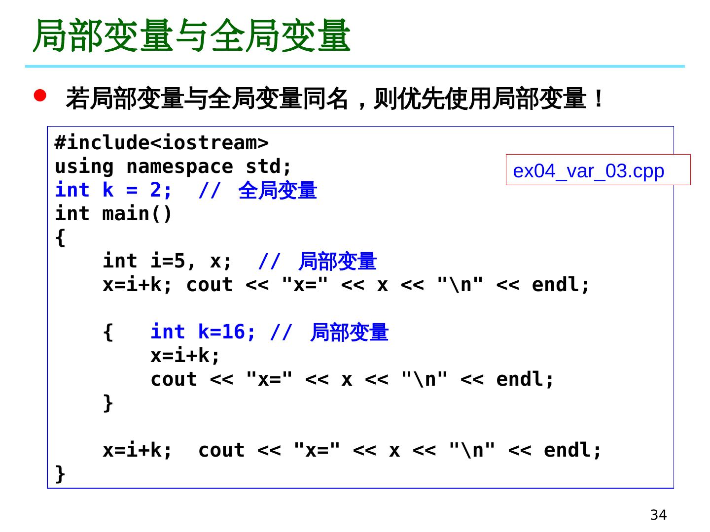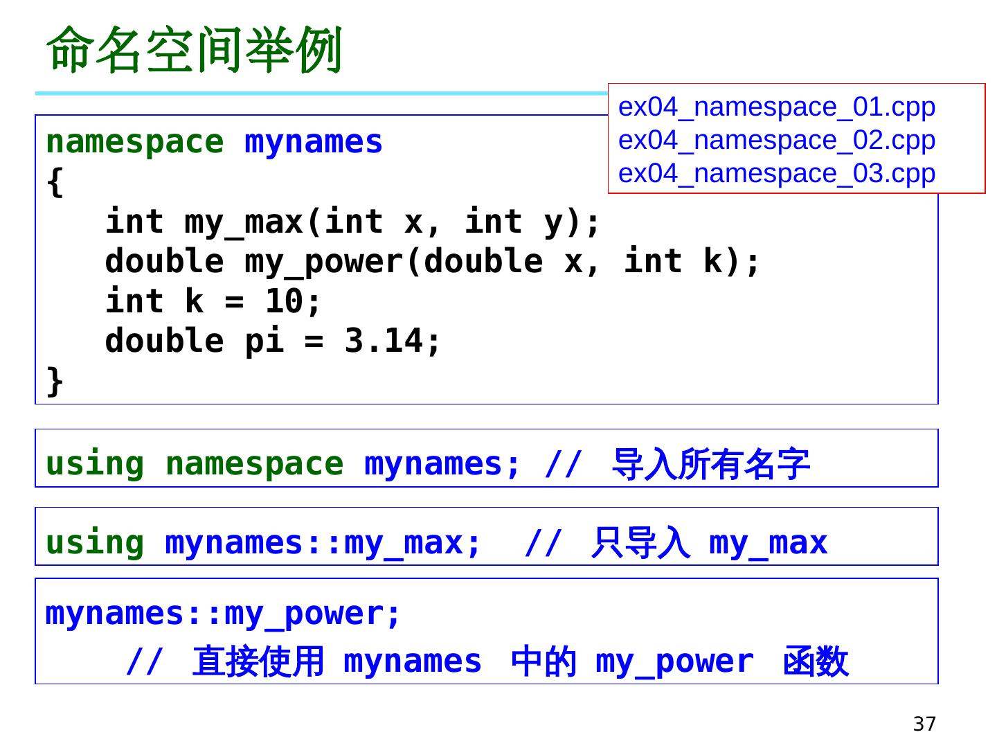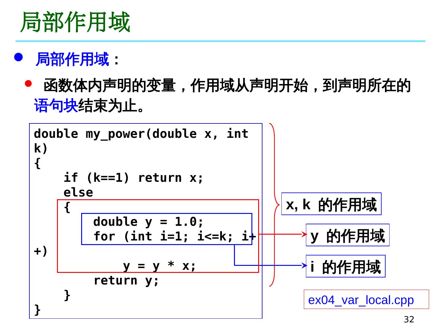 15 .15 举例 int main() { ... ... x = 3.0; n = 2; y = my_power (x, n); ... ... } ex04_fun_11.cpp double my_power (double x, int k) { ... ... } 思考:编写一个函数,交换两个整数的值 ex04_fun_12.cpp