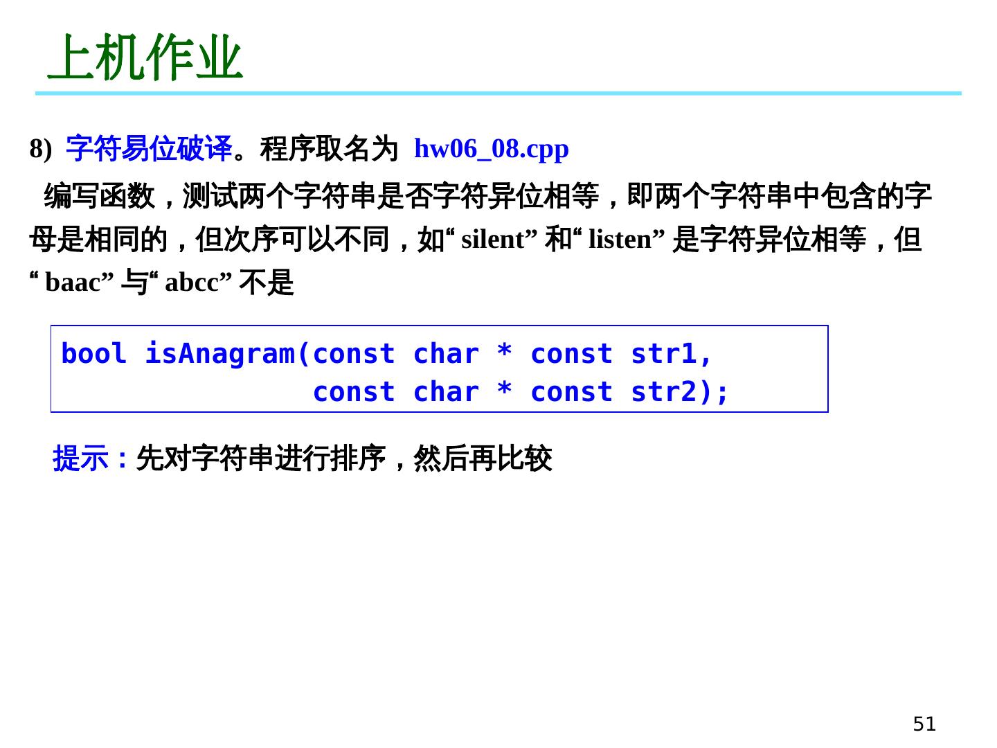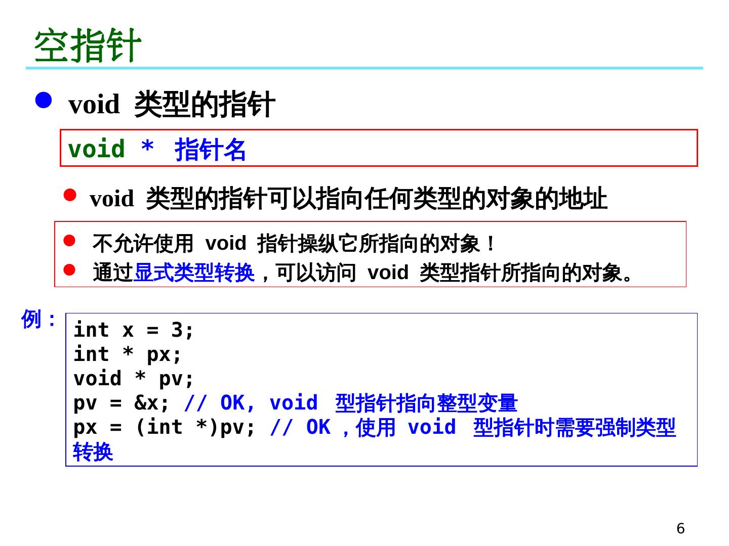 6 .6 空指针 void 类型的指针 void * 指针名 void 类型的指针可以指向任何类型的对象的地址 不允许使用 void 指针操纵它所指向的对象! 通过 显式类型转换 ,可以访问 void 类型指针所指向的对象。 int x = 3; int * px ; void * pv ; pv = &x; // OK, void 型指针指向整型变量 px = ( int *) pv ; // OK ,使用 void 型指针时需要强制类型转换 例: