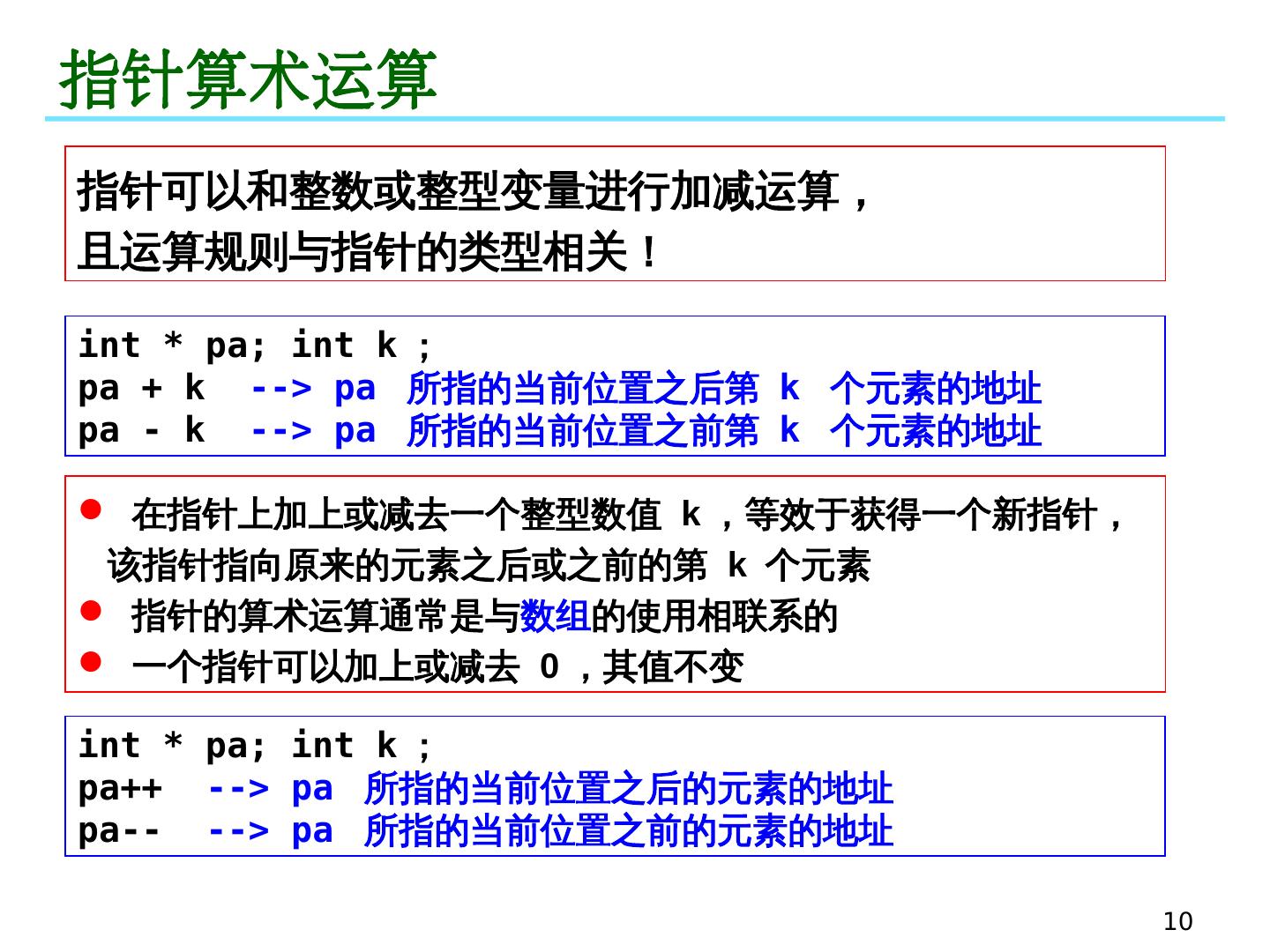 10 .10 指针算术运算 int * pa; int k ; pa + k --> pa 所指的当前位置之后第 k 个元素的地址 pa - k --> pa 所指的当前位置之前第 k 个元素的地址 指针可以和整数或整型变量进行加减运算, 且运算规则与指针的类型相关! 在指针上加上或减去一个整型数值 k ,等效于获得一个新指针,该指针指向原来的元素之后或之前的第 k 个元素 指针的算术运算通常是与 数组 的使用相联系的 一个指针可以加上或减去 0 ,其值不变 int * pa; int k ; pa++ --> pa 所指的当前位置之后的元素的地址 pa-- --> pa 所指的当前位置之前的元素的地址
