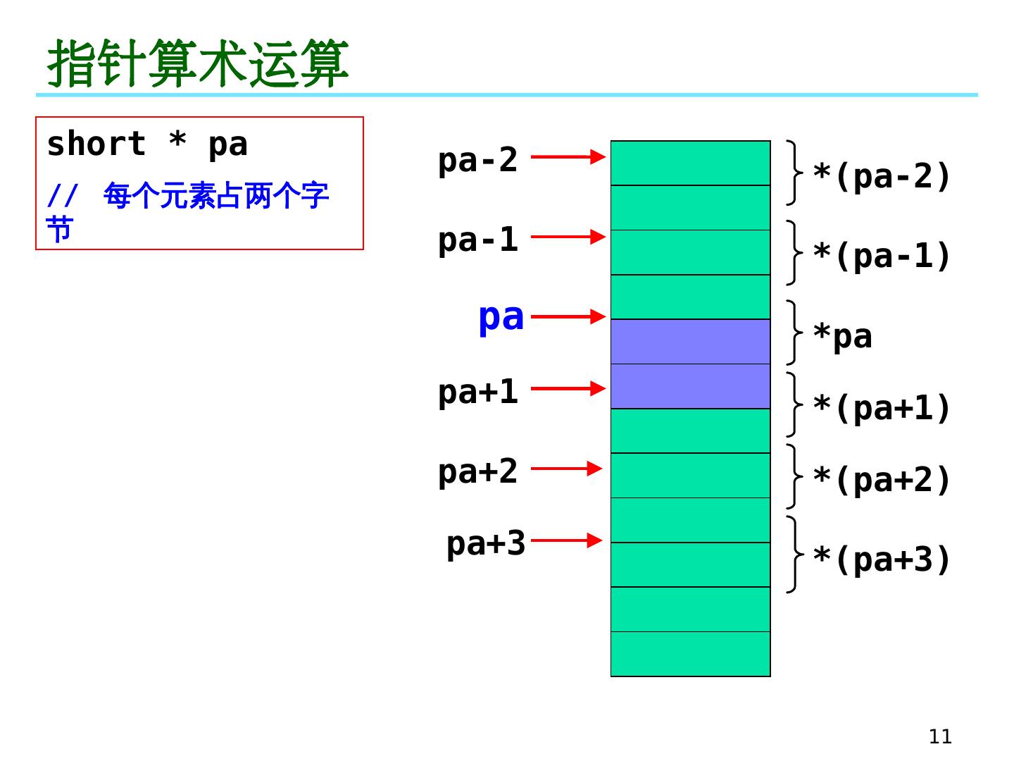 11 .11 指针算术运算 pa pa-2 pa-1 pa+1 pa+2 pa+3 * (pa-2) * pa * (pa+1) * (pa+2) * (pa+3) * (pa-1) short * pa // 每个元素占两个字节