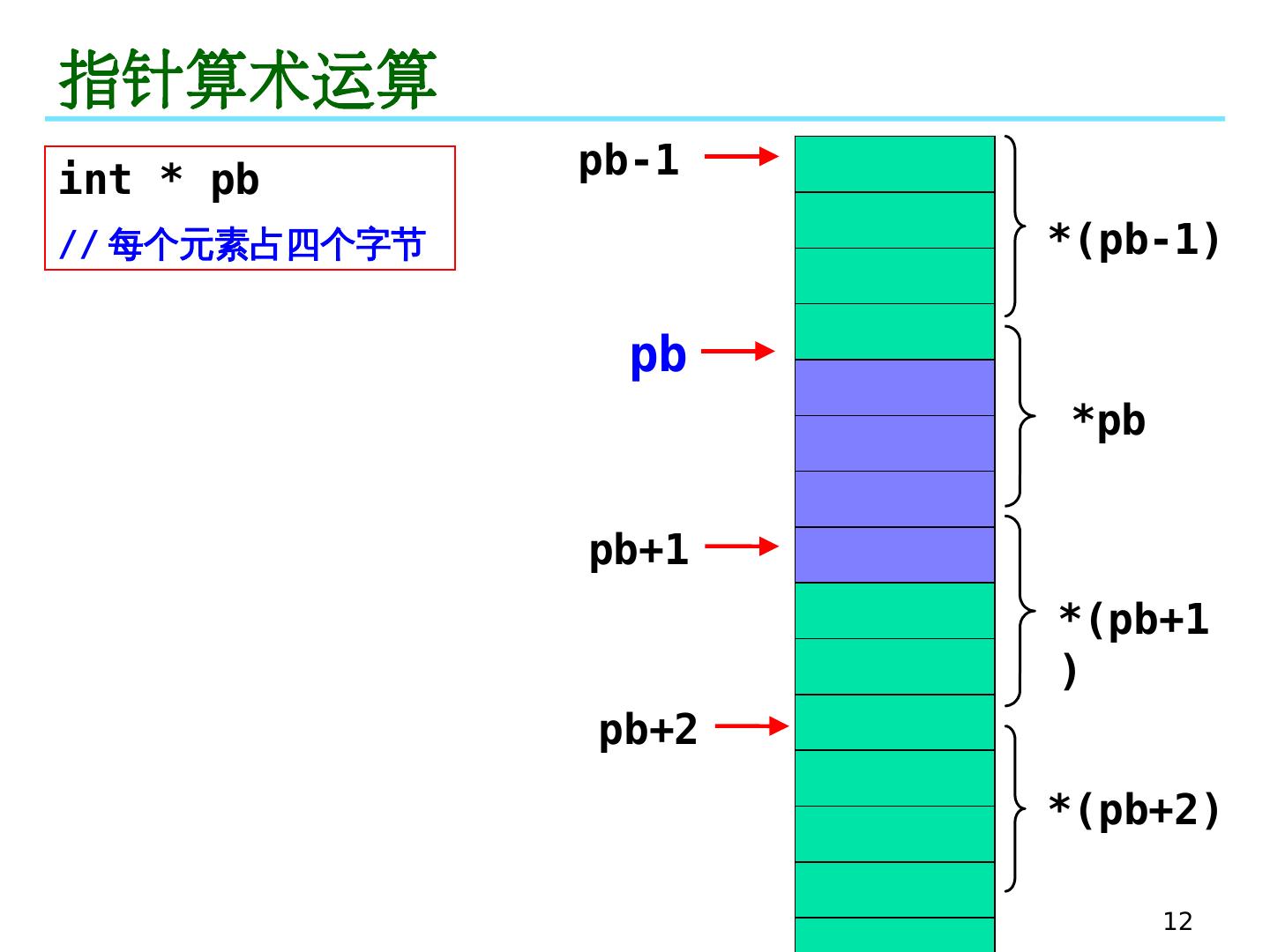 12 .12 指针算术运算 pb pb-1 pb+1 pb+2 * pb * (pb+1) * (pb+2) * (pb-1) int * pb // 每个元素占四个字节