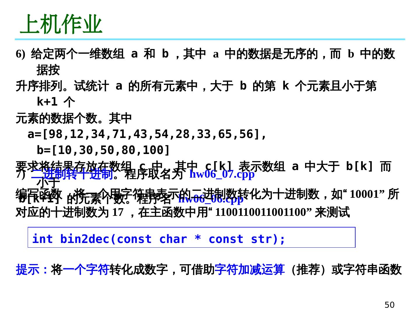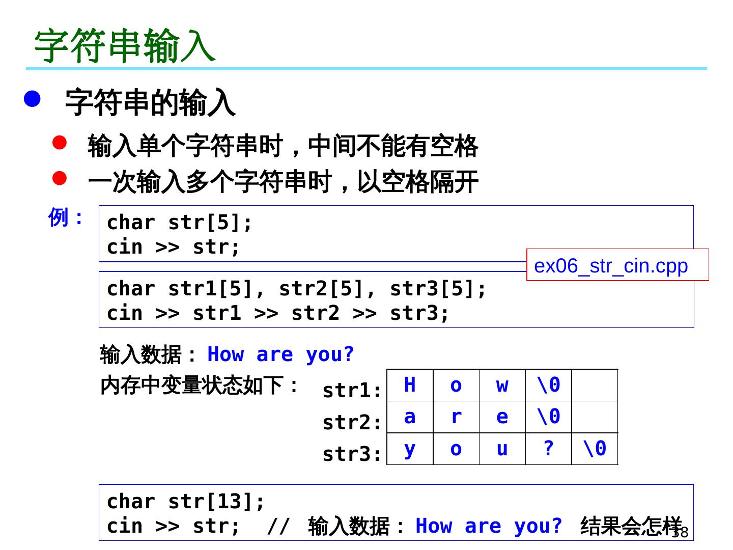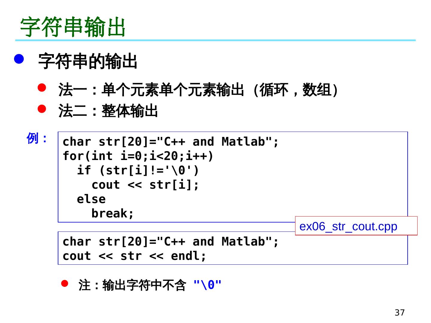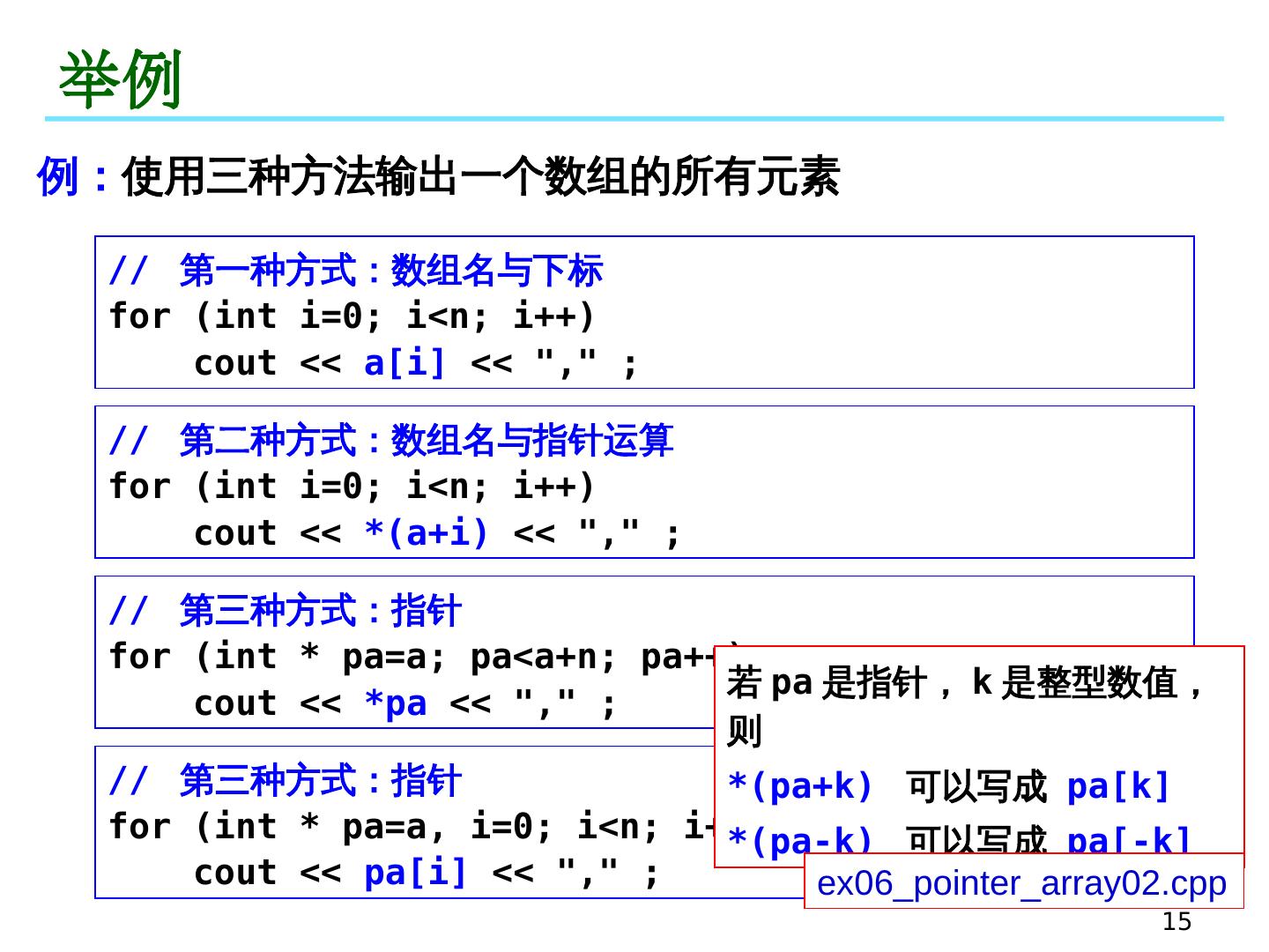 15 .15 举例 例: 使用三种方法输出一个数组的所有元素 // 第一种方式:数组名与下标 for (int i=0; i<n; i++) cout << a[i] << "," ; // 第二种方式:数组名与指针运算 for (int i=0; i<n; i++) cout << *(a+i) << "," ; // 第三种方式:指针 for (int * pa=a; pa<a+n; pa++) cout << *pa << "," ; // 第三种方式:指针 for (int * pa=a, i=0; i<n; i++) cout << pa[i] << "," ; 若 pa 是指针, k 是整型数值,则 * (pa+k) 可以写成 pa[k] * (pa-k) 可以写成 pa[-k] ex06_pointer_array02.cpp
