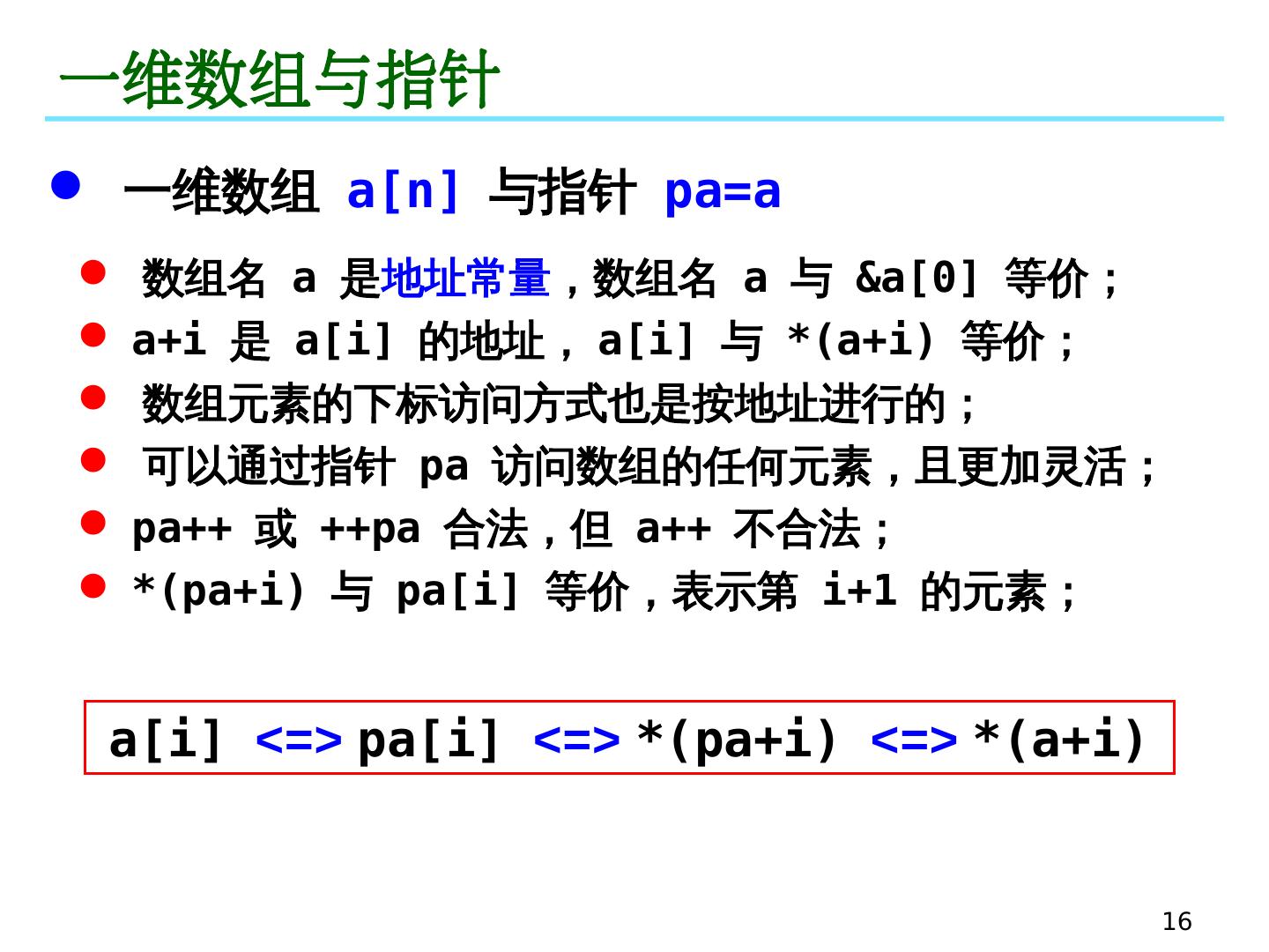 16 .16 一维数组与指针 一维数组 a[n] 与指针 pa=a 数组名 a 是 地址常量 ,数组名 a 与 &a[0] 等价; a+i 是 a[i] 的地址, a[i] 与 *(a+i) 等价; 数组元素的下标访问方式也是按地址进行的; 可以通过指针 pa 访问数组的任何元素,且更加灵活; pa++ 或 ++pa 合法,但 a++ 不合法; *(pa+i) 与 pa[i] 等价,表示第 i+1 的元素; a[ i ] <=> pa[ i ] <=> *( pa+i ) <=> *( a+i )
