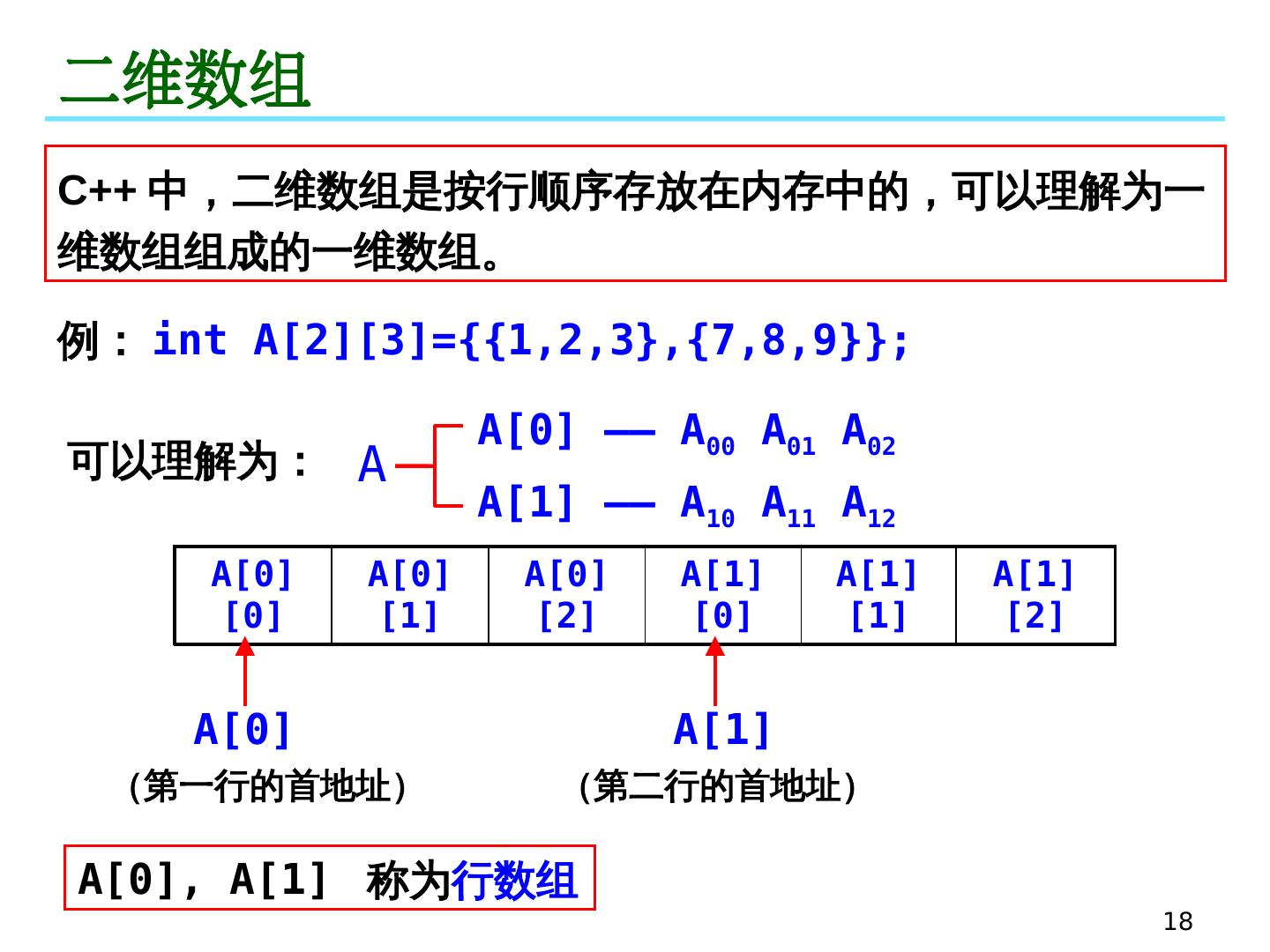 18 .18 二维数组 例: int A[2][3]={{1,2,3},{7,8,9}}; C++ 中,二维数组是按行顺序存放在内存中的,可以理解为一维数组组成的一维数组。 A[0] —— A 00 A 01 A 02 A[1] —— A 10 A 11 A 12 A 可以理解为: A[0][0] A[0][1] A[0][2] A[1][0] A[1][1] A[1][2] A[0] A[1] (第一行的首地址) (第二行的首地址) A[0], A[1] 称为 行数组