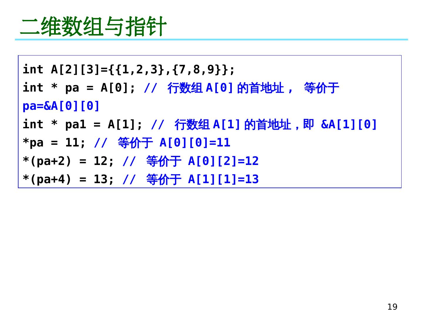 19 .19 二维数组与指针 int A[2][3]={{1,2,3},{7,8,9}}; int * pa = A[0]; // 行数组 A[0] 的首地址 , 等价于 pa=&A[0][0] int * pa1 = A[1]; // 行数组 A[1] 的首地址,即 &A[1][0] *pa = 11; // 等价于 A[0][0]=11 *(pa+2) = 12; // 等价于 A[0][2]=12 *(pa+4) = 13; // 等价于 A[1][1]=13