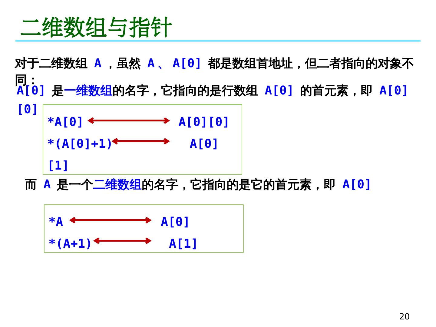 20 .20 二维数组与指针 对于二维数组 A ,虽然 A 、 A[0] 都是数组首地址,但二者指向的对象不同: 而 A 是一个 二维数组 的名字,它指向的是它的首元素,即 A[0] A[0] 是 一维数组 的名字,它指向的是行数组 A[0] 的首元素,即 A[0][0] * A[0] A[0][0] * (A[0]+1) A[0][1] * A A[0] * (A+1) A[1]
