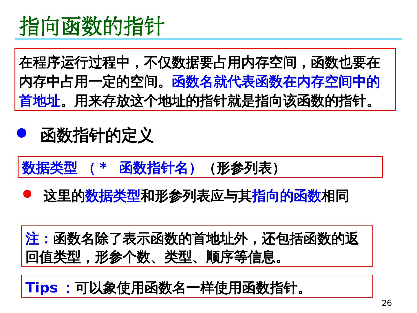 26 .26 指向函数的指针 在程序运行过程中,不仅数据要占用内存空间, 函数 也要在内存中占用一定的空间。 函数名就代表函数在内存空间中的首地址 。用来存放这个地址 的 指针就是指向该函数的指针。 函数指针的定义 Tips : 可以象使用函数名一样使用函数指针。 注: 函数名除了表示函数的首地址外,还包括函数的返回值类型,形参个数、类型、顺序等信息。 数据类型 (* 函数指针名) (形参列表) 这里的 数据类型 和形参列表应与其 指向的函数 相同
