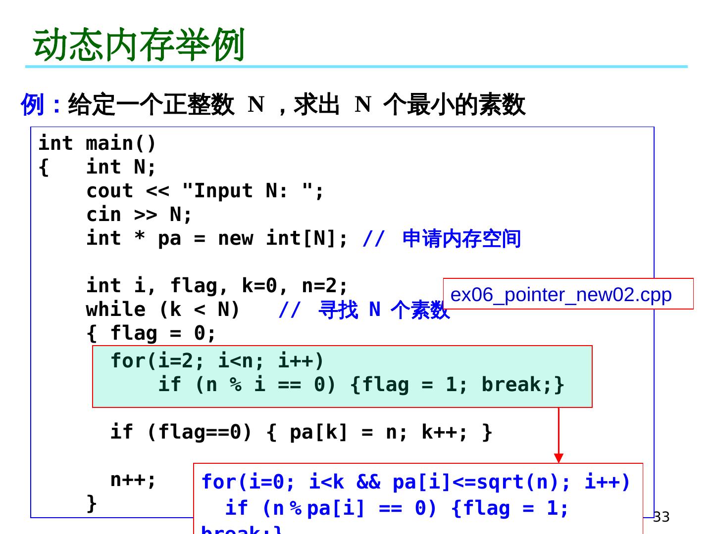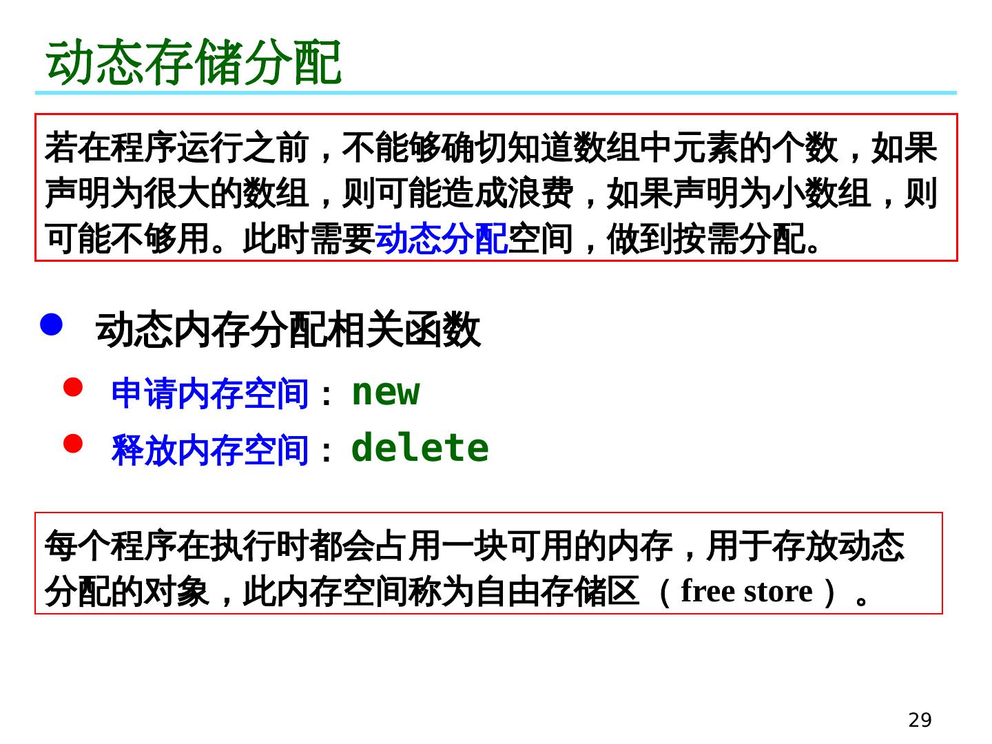 29 .29 动态存储分配 申请内存空间 : new 释放内存空间 : delete 若在程序运行之前,不能够确切知道数组中元素的个数,如果声明为很大的数组,则可能造成浪费,如果声明为小数组,则可能不够用。此时需要 动态分配 空间,做到按需分配。 动态内存分配相关函数 每个程序在执行时都会占用一块可用的内存,用于存放动态分配的对象,此内存空间称为自由存储区( free store )。