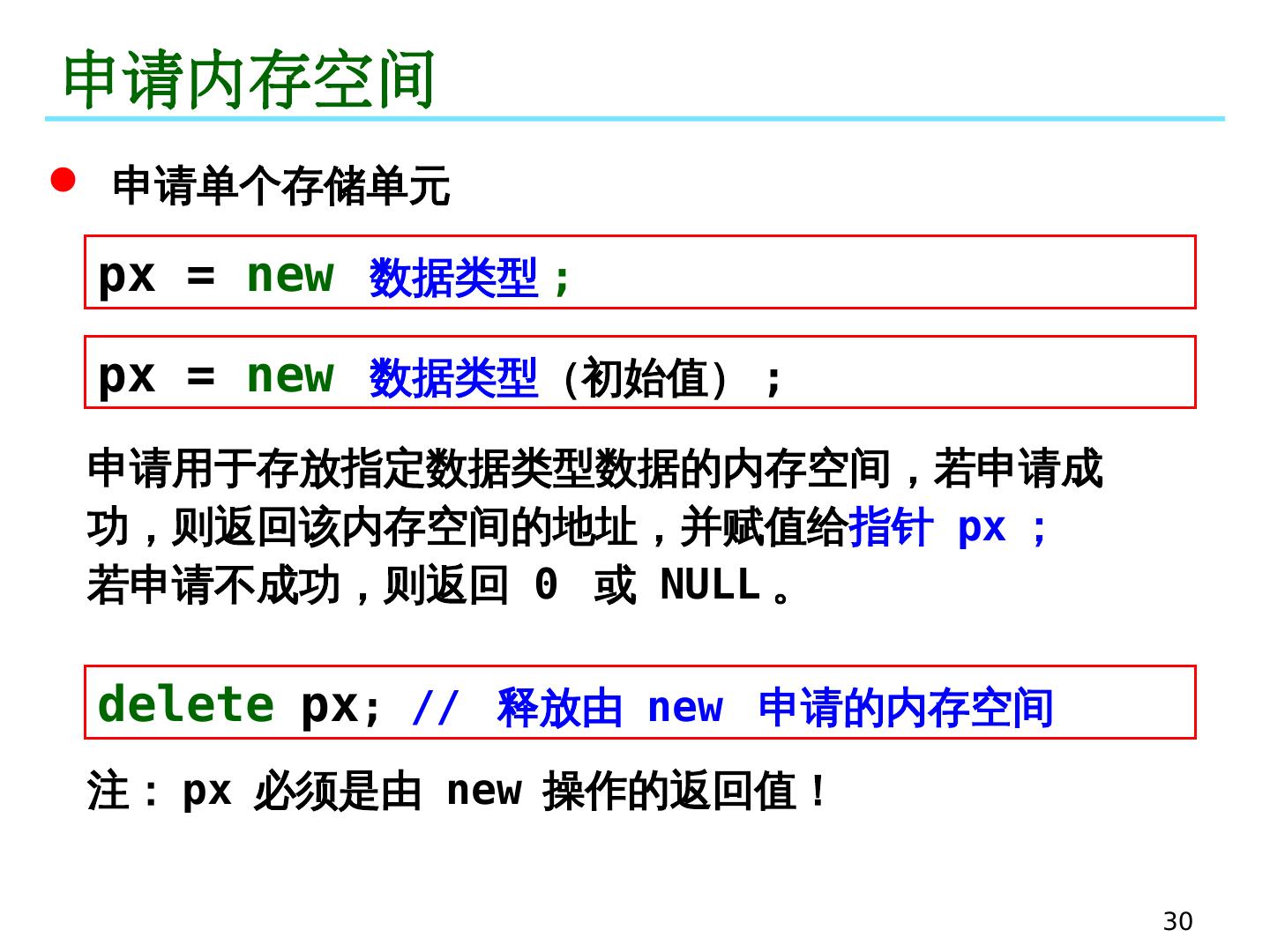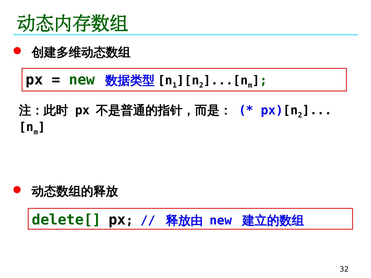 28 .28 持久 动态存储分配 动态内存申请 --- new 动态内存释放 --- delete 动态数组的申请与释放 在被调函数中申请动态内存 , 返回给主调函数