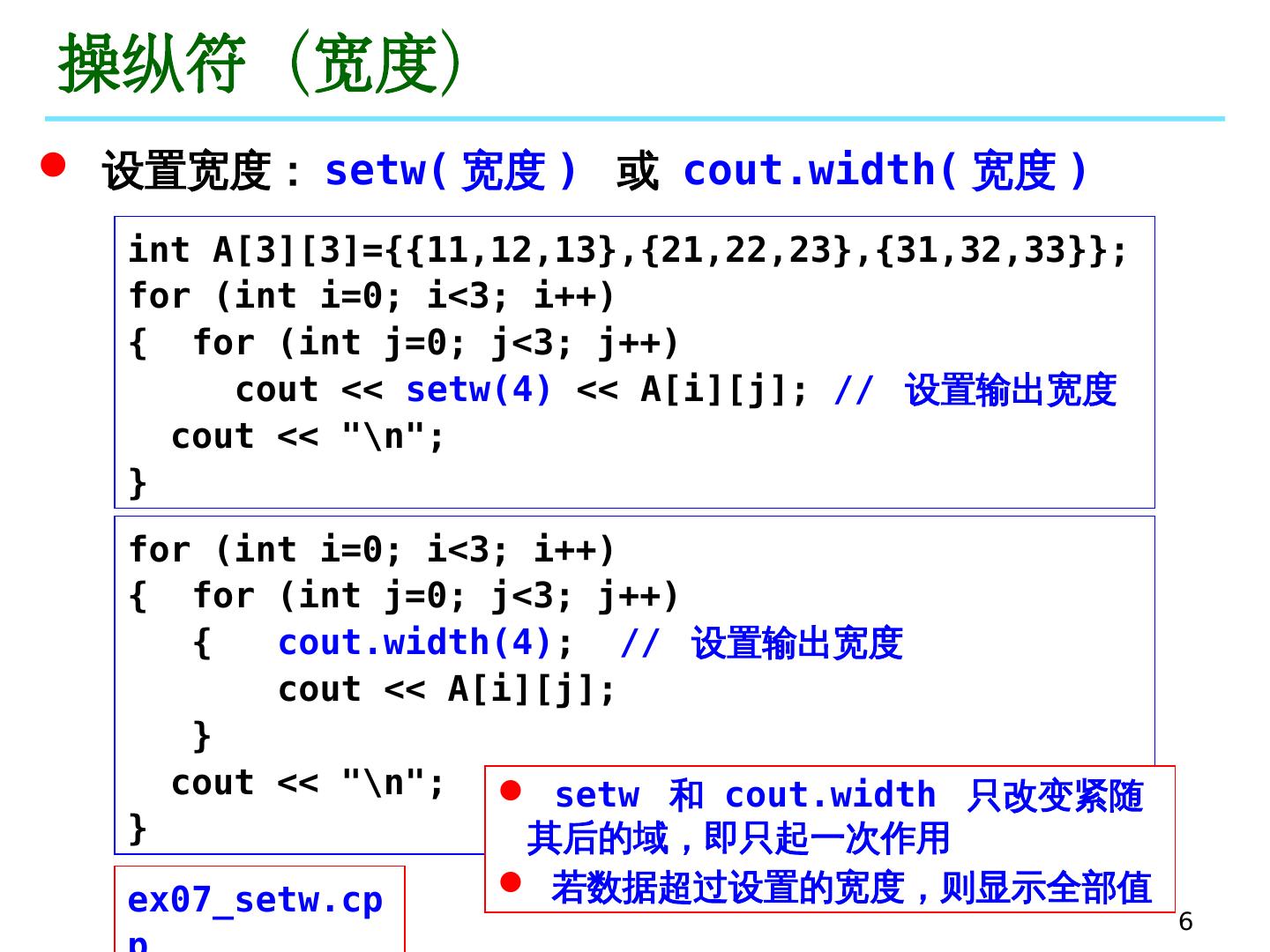 6 .6 操纵符(宽度) 设置宽度: setw( 宽度 ) 或 cout.width( 宽度 ) int A[3][3]={{11,12,13},{21,22,23},{31,32,33}}; for (int i=0; i<3; i++) { for (int j=0; j<3; j++) cout << setw(4) << A[i][j]; // 设置输出宽度 cout << "