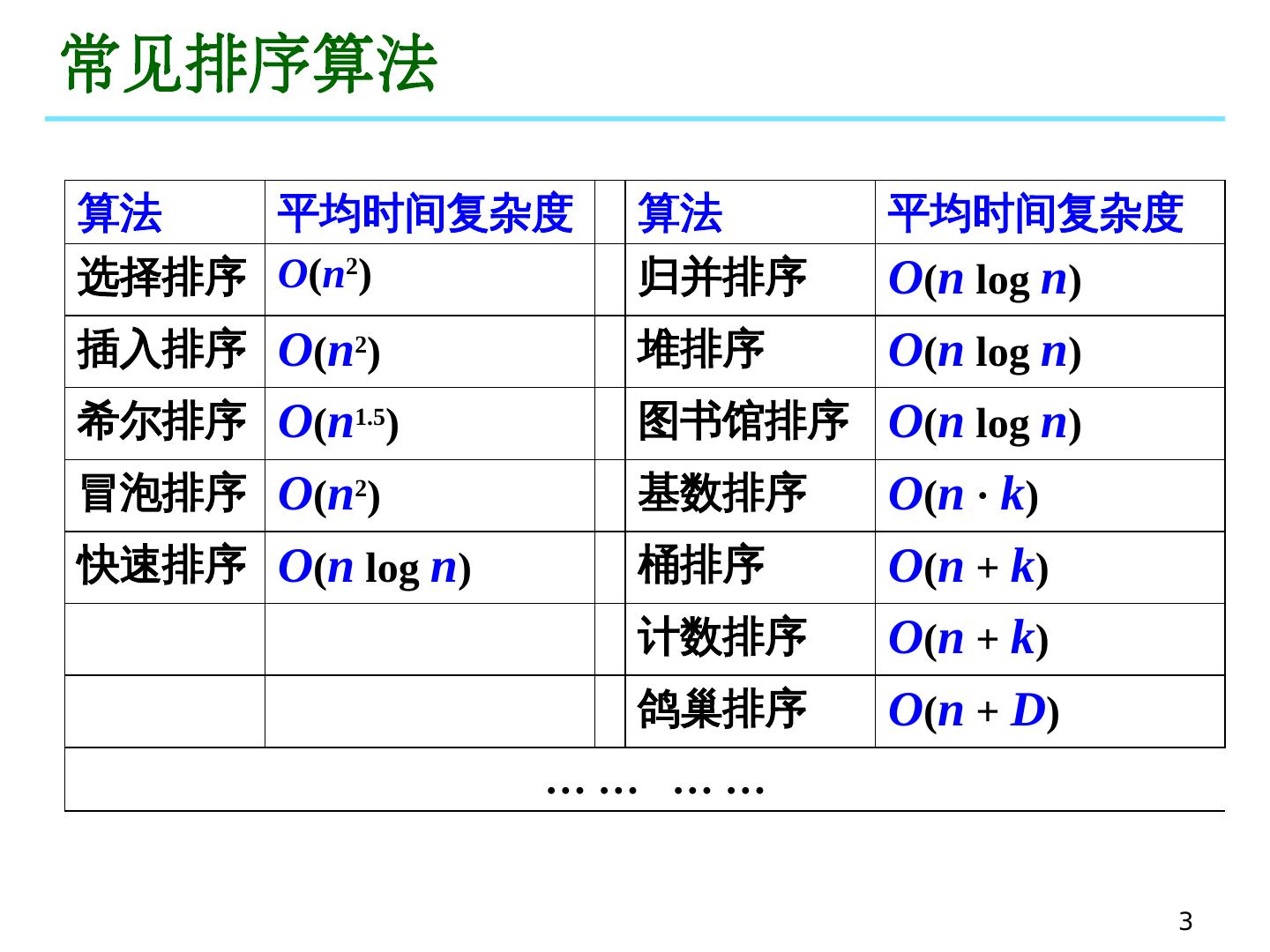 3 .3 常见排序算法 算法 平均时间复杂度 算法 平均时间复杂度 选择排序 O ( n 2 ) 归并排序 O ( n log n ) 插入排序 O ( n 2 ) 堆排序 O ( n log n ) 希尔排序 O ( n 1.5 ) 图书馆排序 O ( n log n ) 冒泡排序 O ( n 2 ) 基数排序 O ( n · k ) 快速排序 O ( n log n ) 桶排序 O ( n + k ) 计数排序 O ( n + k ) 鸽巢排序 O ( n + D ) … … … …