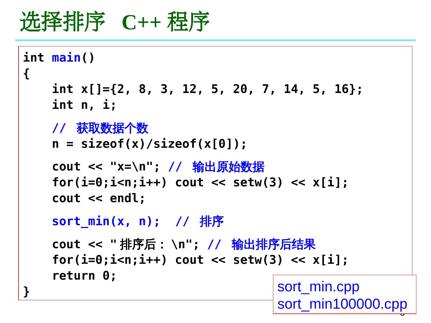 8 .8 选择 排序 C ++ 程序 int main () { int x[]={2, 8, 3, 12, 5, 20, 7, 14, 5, 16}; int n, i ; // 获取数据个数 n = sizeof (x)/ sizeof (x[0 ]); cout << "x=