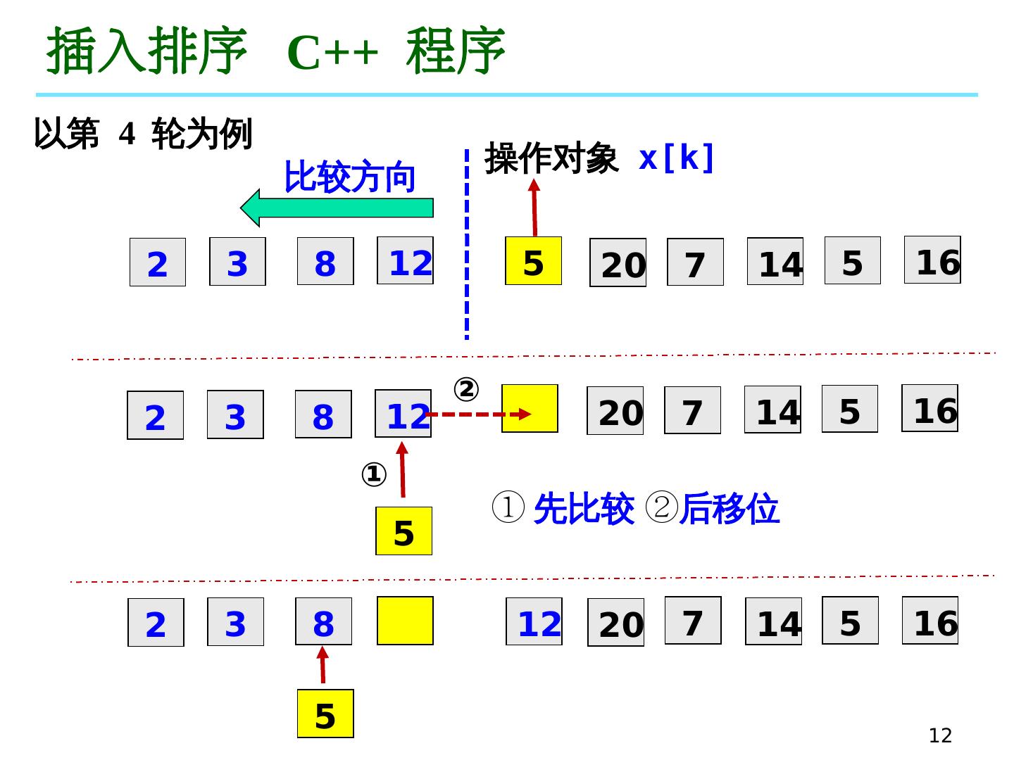 12 .12 插入排序 C++ 程序 以第 4 轮为例 2 3 8 12 5 20 7 14 5 16 操作 对象 x[k] 比较方向 2 3 8 12 5 20 7 14 5 16 ① 先比较 ② 后移位 ① ② 2 3 8 12 20 7 14 5 16 5
