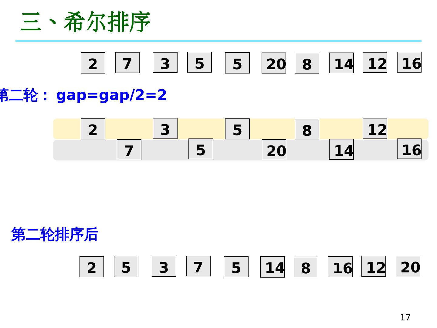 16 .16 三、希 尔排 序 2 8 3 12 5 20 7 14 5 16 第一轮: gap=10/2=5 2 8 3 12 5 20 7 14 5 16 第一轮排序后 2 7 3 5 5 20 8 14 12 16