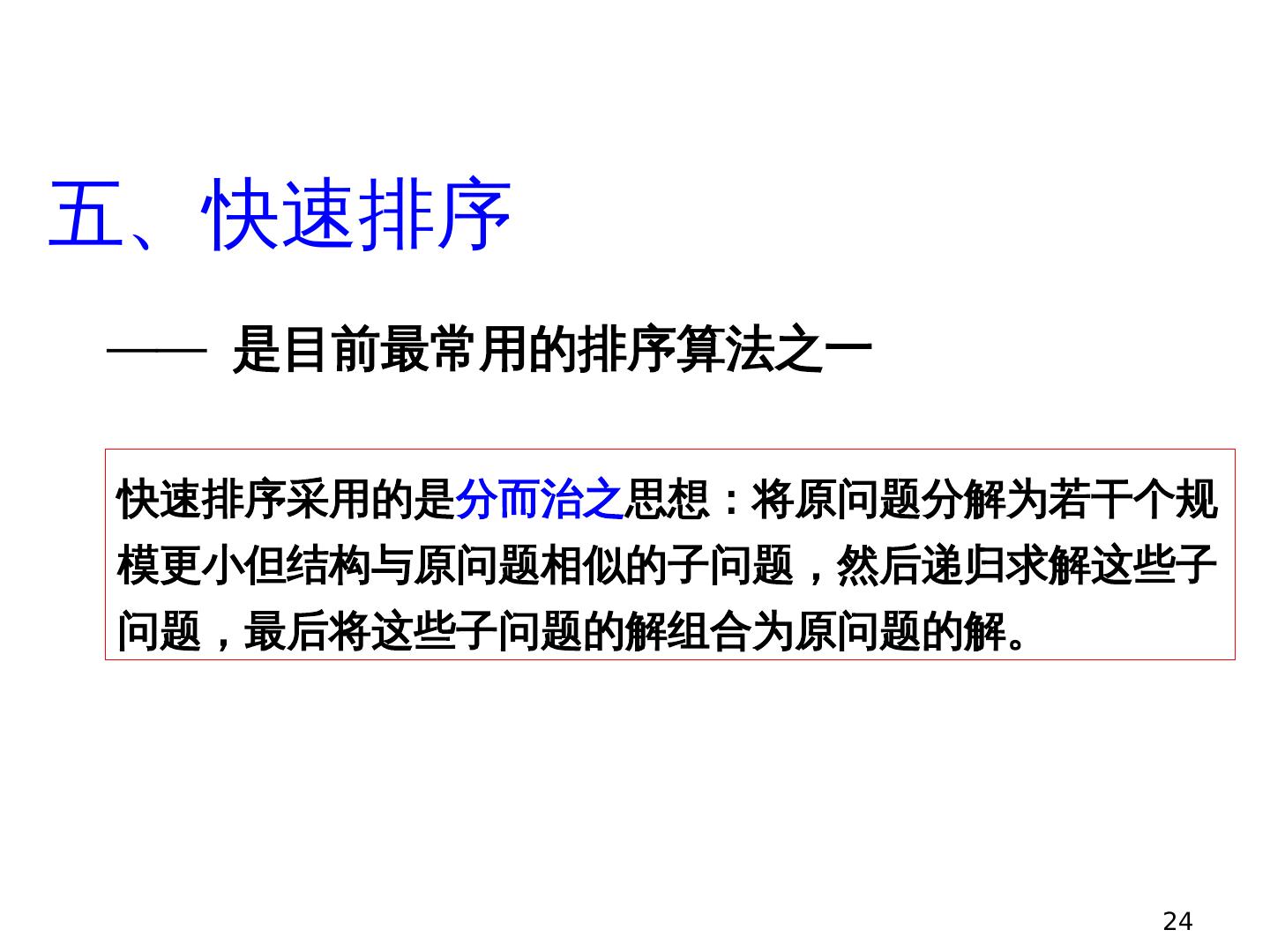 24 .24 五、快速排序 快速排序采用的是 分而治之 思想: 将原问题分解为若干个规模更小但结构与原问题相似的子 问题,然后递归求解 这些子问题 ,最后将 这些子问题的解组合为原问题的解。 —— 是 目前最常用的排序算法 之一