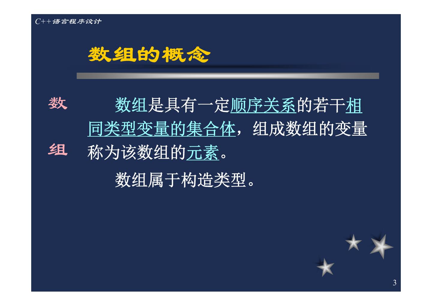 3 .C++语言程序设计 数 数组的概念 数组是具有一定顺序关系的若干相 组 同类型变量的集合体,组成数组的变量 称为该数组的元素。 数组属于构造类型。 3