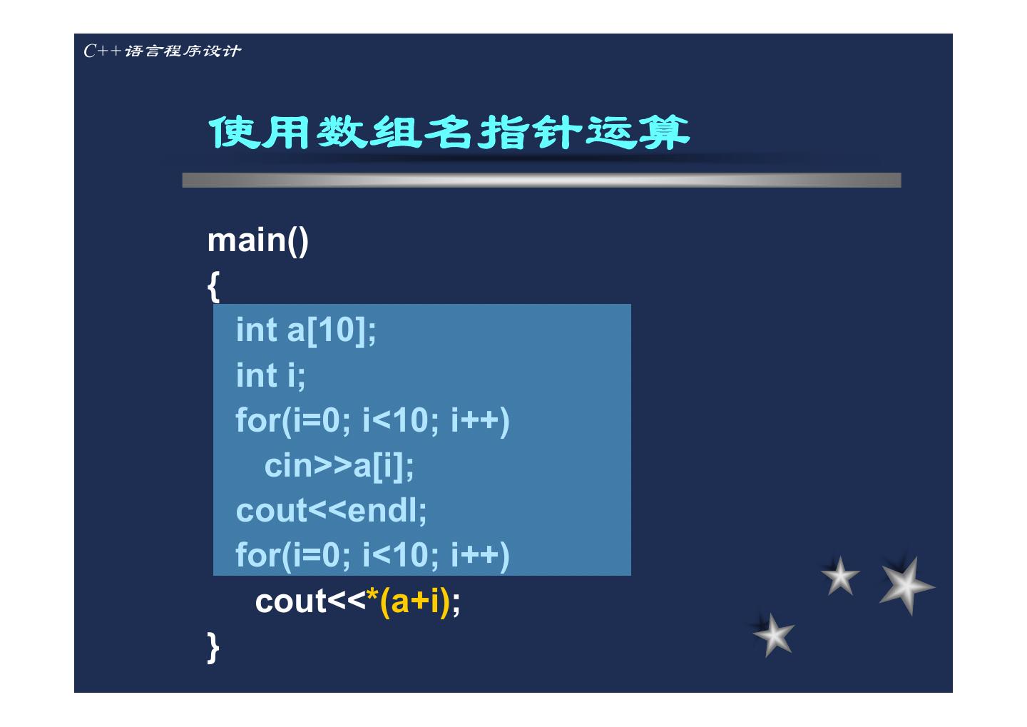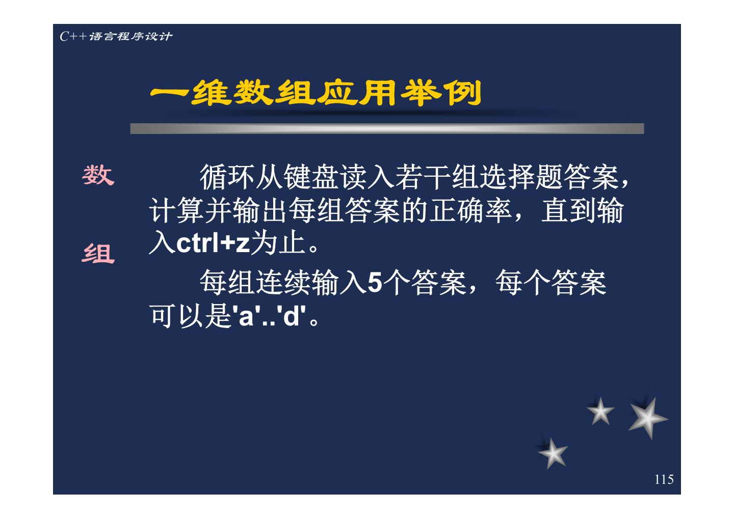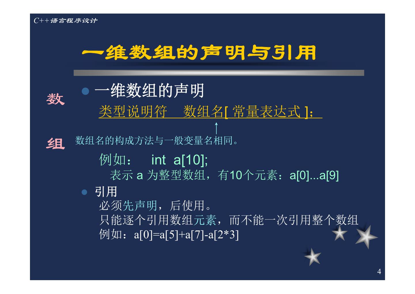 4 .C++语言程序设计 数 一维数组的声明与引用 一维数组的声明 类型说明符 数组名[ 常量表达式 ]; 组 数组名的构成方法与一般变量名相同。 例如: int a[10]; 表示 a 为整型数组,有10个元素:a[0]...a[9] 引用 必须先声明,后使用。 只能逐个引用数组元素,而不能一次引用整个数组 例如:a[0]=a[5]+a[7]-a[2*3] 4