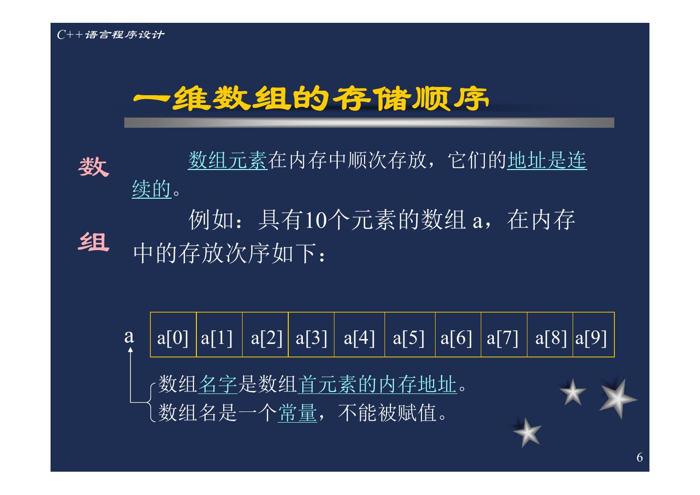 6 .C++语言程序设计 数 一维数组的存储顺序 数组元素在内存中顺次存放,它们的地址是连 续的。 组 例如:具有10个元素的数组 a,在内存 中的存放次序如下: a a[0] a[1] a[2] a[3] a[4] a[5] a[6] a[7] a[8] a[9] 数组名字是数组首元素的内存地址。 数组名是一个常量,不能被赋值。 6