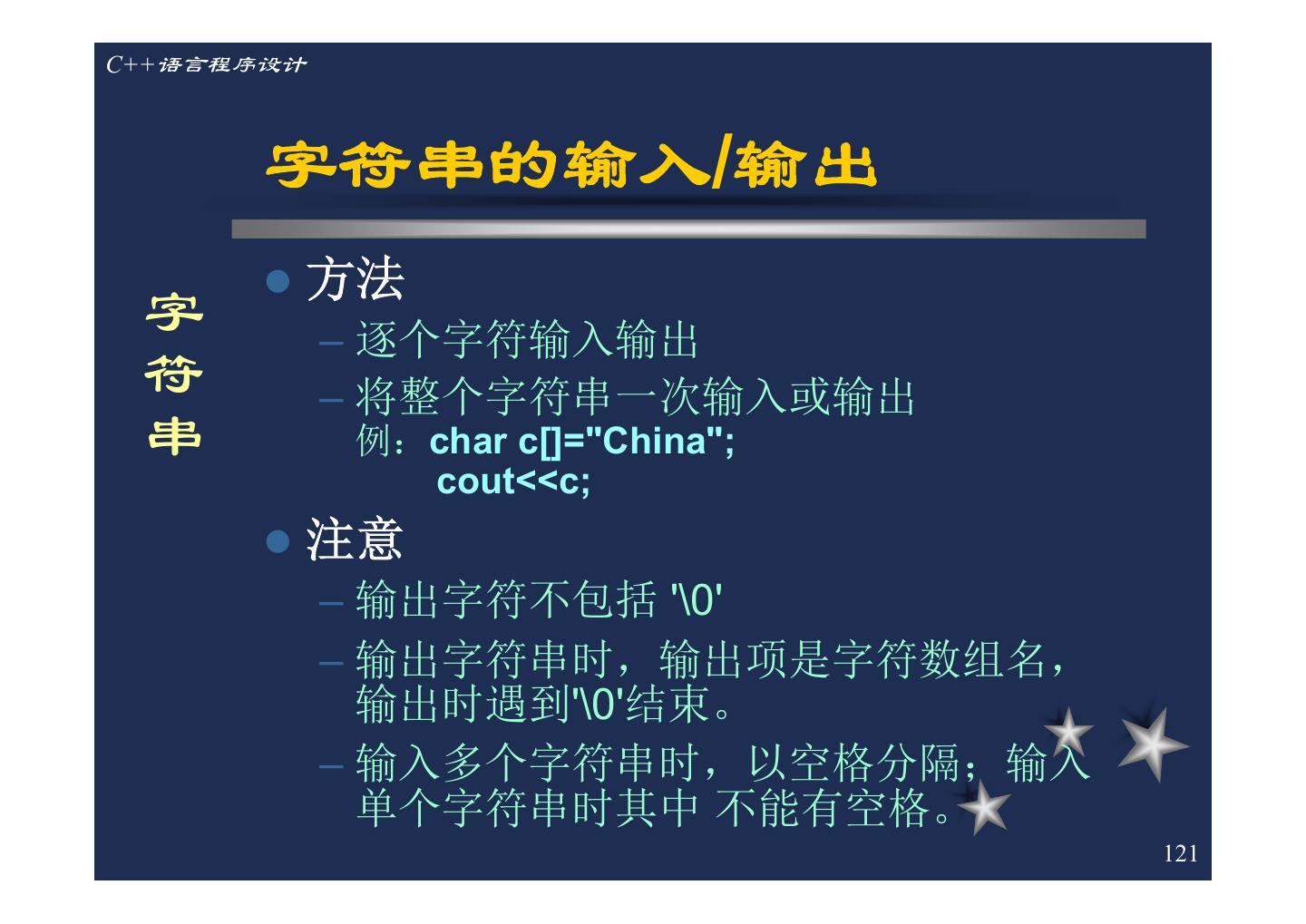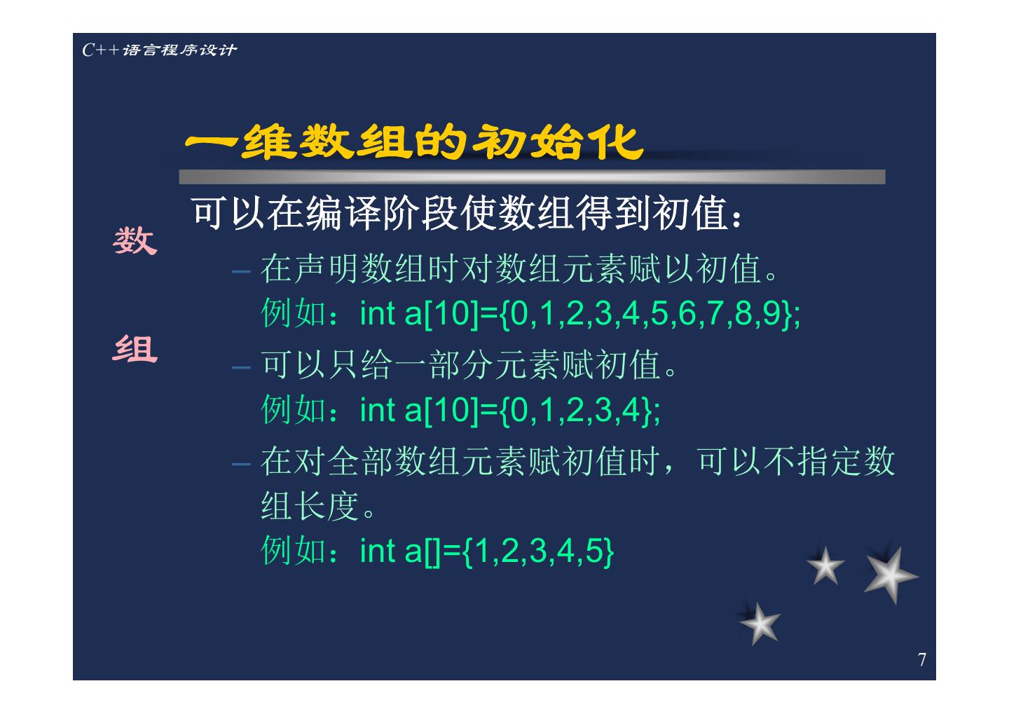 7 .C++语言程序设计 数 一维数组的初始化 可以在编译阶段使数组得到初值: – 在声明数组时对数组元素赋以初值。 组 例如:int a[10]={0,1,2,3,4,5,6,7,8,9}; – 可以只给一部分元素赋初值。 例如:int a[10]={0,1,2,3,4}; – 在对全部数组元素赋初值时,可以不指定数 组长度。 例如:int a[]={1,2,3,4,5} 7