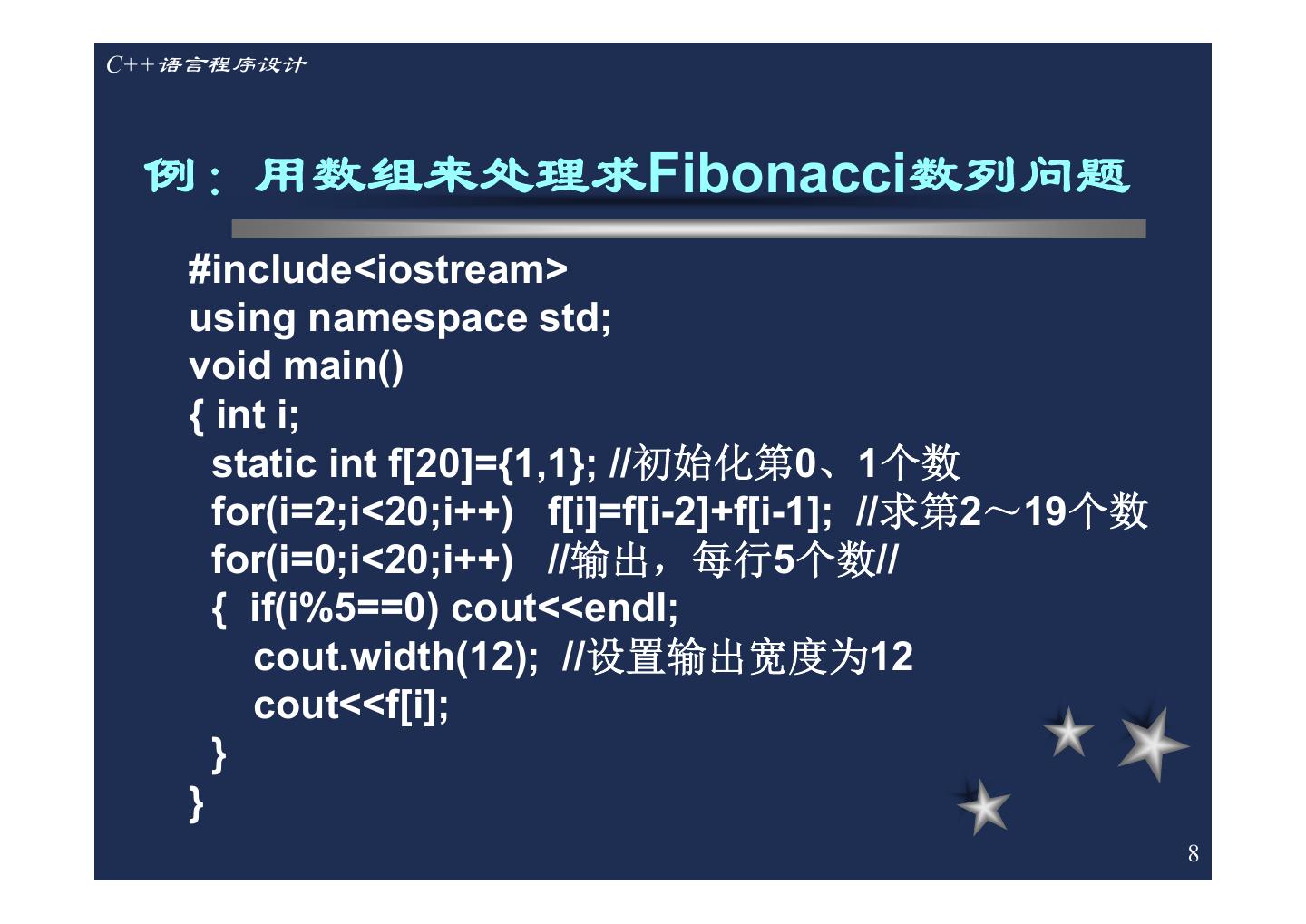 8 .C++语言程序设计 例:用数组来处理求Fibonacci数列问题 #include<iostream> using namespace std; void main() { int i; static int f[20]={1,1}; //初始化第0、1个数 for(i=2;i<20;i++) f[i]=f[i-2]+f[i-1]; //求第2~19个数 for(i=0;i<20;i++) //输出,每行5个数// { if(i%5==0) cout<<endl; cout.width(12); //设置输出宽度为12 cout<<f[i]; } } 8