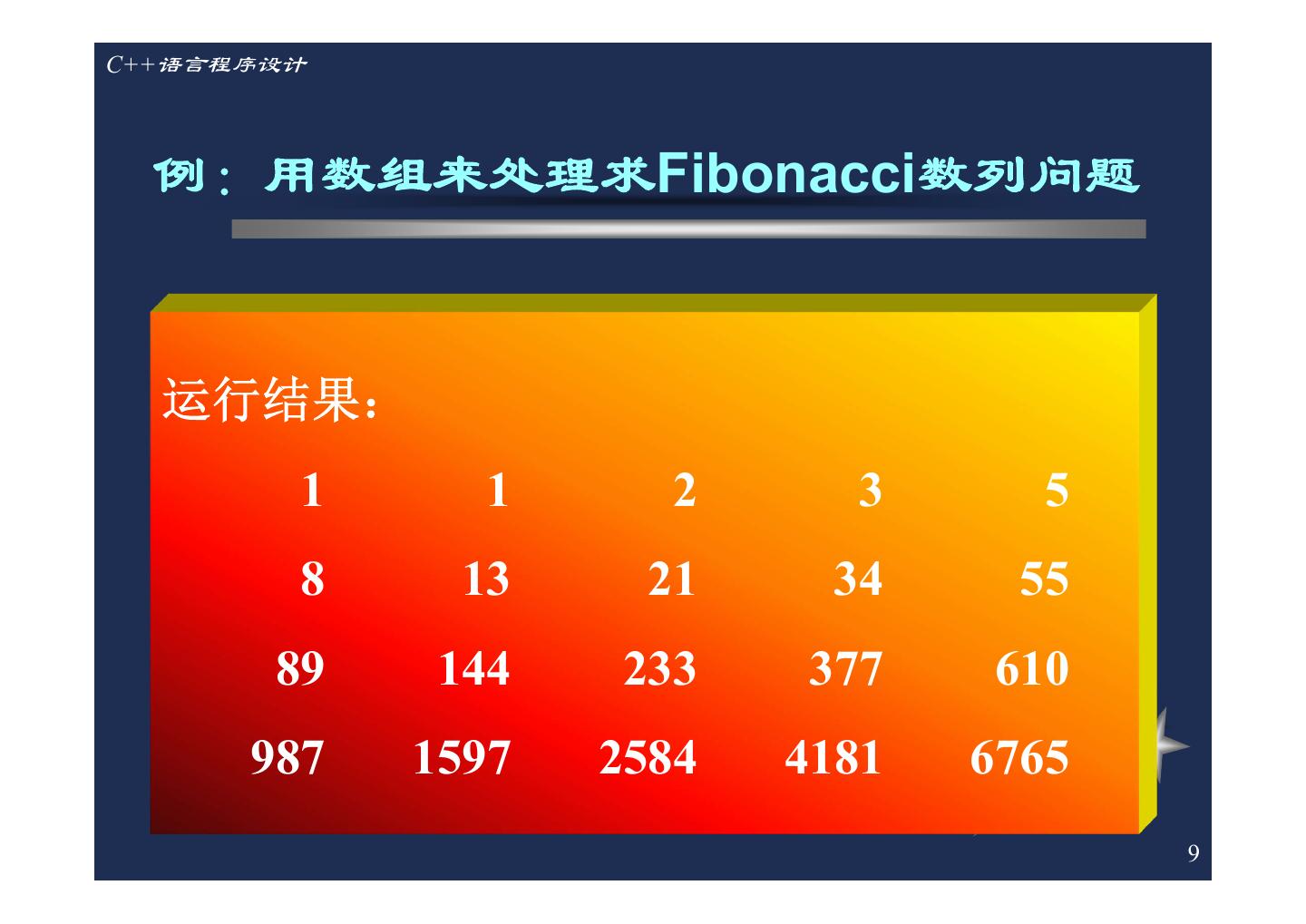 9 .C++语言程序设计 例:用数组来处理求Fibonacci数列问题 运行结果: 1 1 2 3 5 8 13 21 34 55 89 144 233 377 610 987 1597 2584 4181 6765 9