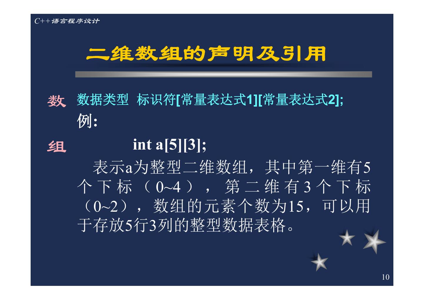 10 .C++语言程序设计 数 二维数组的声明及引用 数据类型 标识符[常量表达式1][常量表达式2]; 例: 组 int a[5][3]; 表示a为整型二维数组,其中第一维有5 个 下 标 ( 0~4 ) , 第 二 维 有 3 个 下 标 (0~2),数组的元素个数为15,可以用 于存放5行3列的整型数据表格。 10