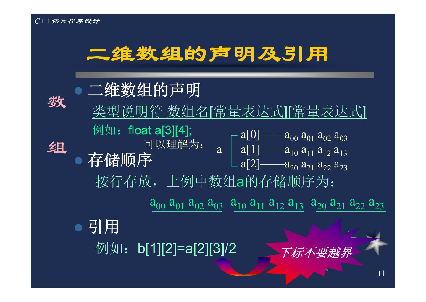 11 .C++语言程序设计 数 二维数组的声明及引用 二维数组的声明 类型说明符 数组名[常量表达式][常量表达式] 组 例如:float a[3][4]; a[0]——a00 a01 a02 a03 可以理解为: a a[1]——a10 a11 a12 a13 存储顺序 a[2]——a20 a21 a22 a23 按行存放,上例中数组a的存储顺序为: a00 a01 a02 a03 a10 a11 a12 a13 a20 a21 a22 a23 引用 例如:b[1][2]=a[2][3]/2 下标不要越界 11