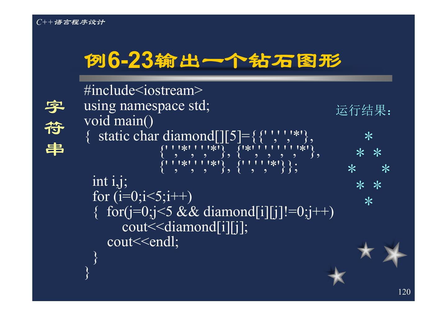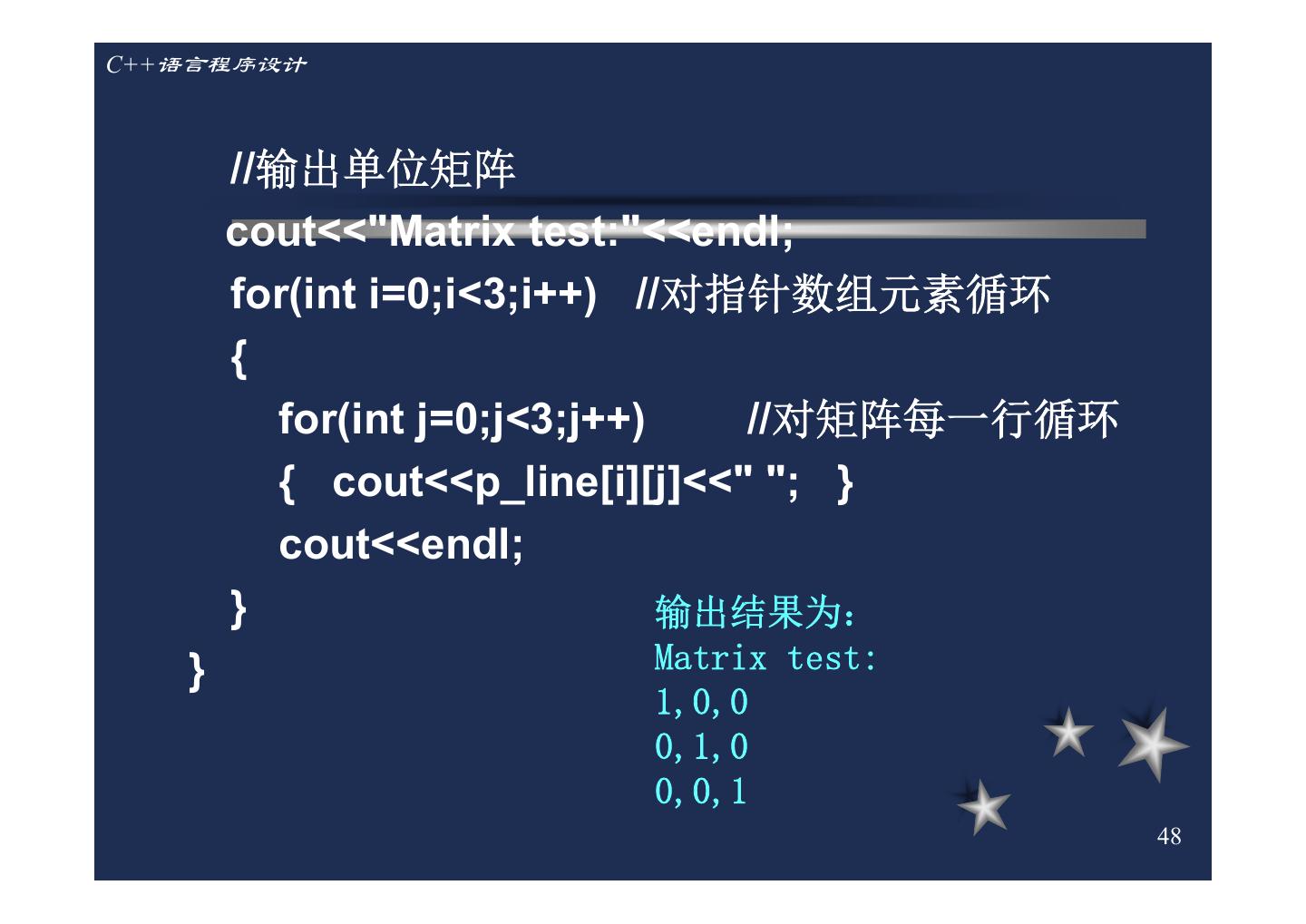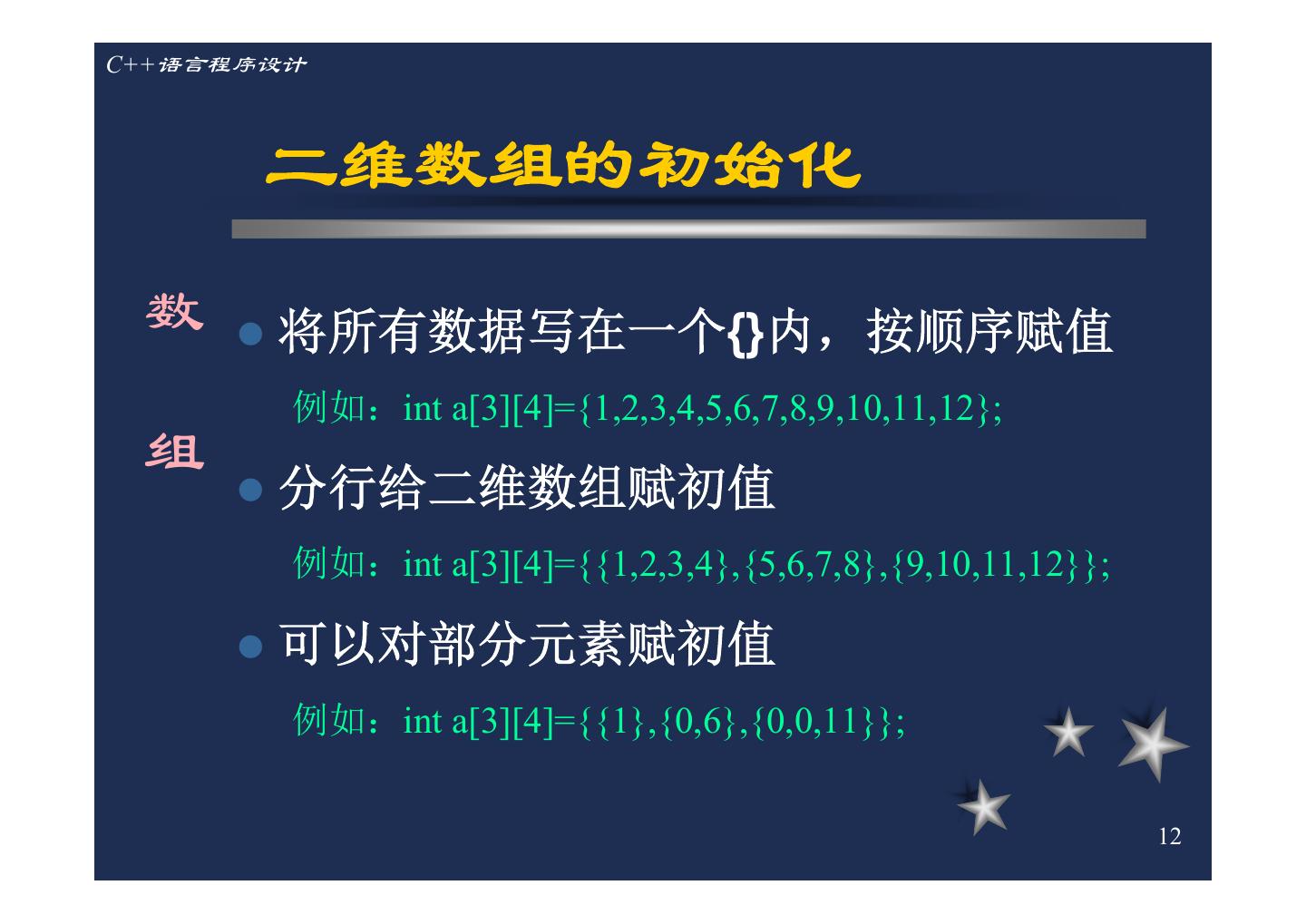 12 .C++语言程序设计 数 二维数组的初始化 将所有数据写在一个{}内,按顺序赋值 组 例如:int a[3][4]={1,2,3,4,5,6,7,8,9,10,11,12}; 分行给二维数组赋初值 例如:int a[3][4]={{1,2,3,4},{5,6,7,8},{9,10,11,12}}; 可以对部分元素赋初值 例如:int a[3][4]={{1},{0,6},{0,0,11}}; 12